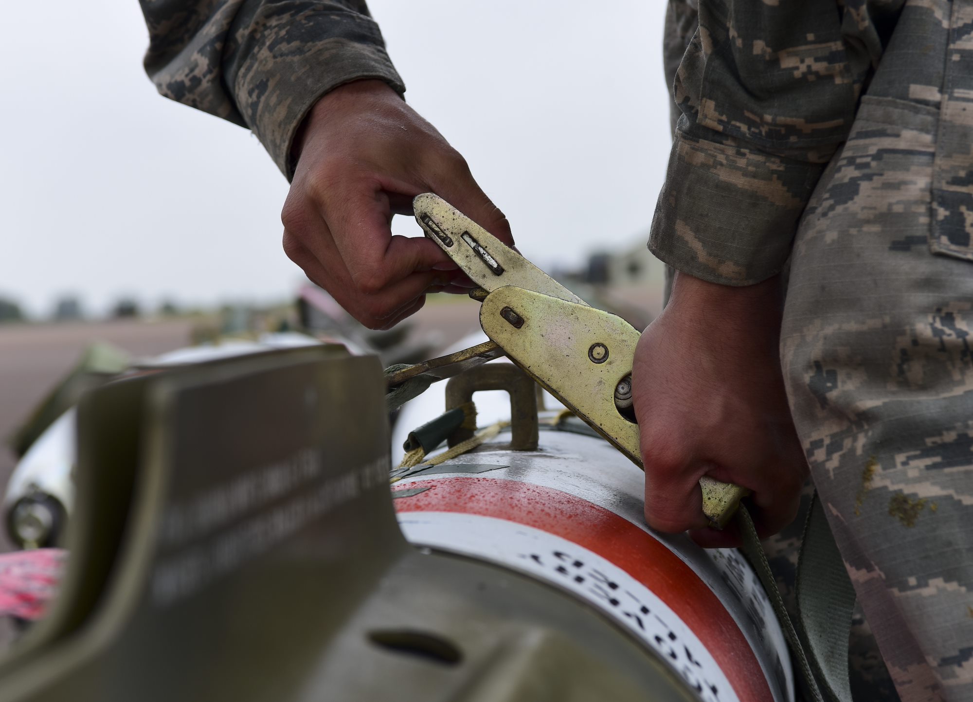 U.S. Air Force Airman 1st Class Julian Tisdale, 2nd Aircraft Maintenance Squadron load crew team member, releases a strap on an inert, (non-explosive) Quick Strike MK 62 mine at Royal Air Force Fairford, U.K., June 5, 2017. Bomber crews are participating in BALTOPS 2017, an annual, multinational, maritime-focused exercise designed to strengthen interoperability and cohesiveness between NATO allies and partnered nations. (U.S. Air Force photo by Airman 1st Class Randahl J. Jenson)