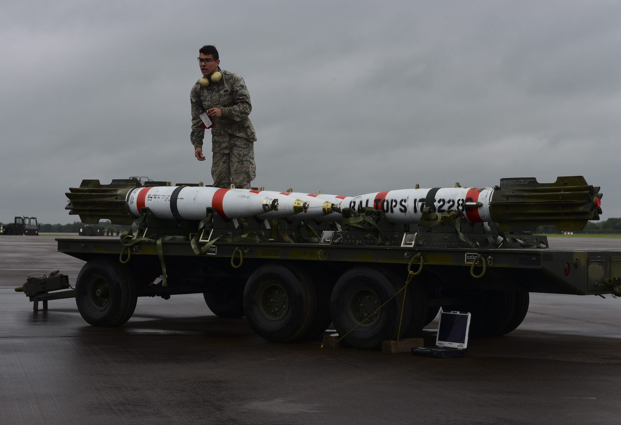 U.S. Air Force Airman 1st Class Julian Tisdale, 2nd Aircraft Maintenance Squadron load crew team member, inspects inert, (non-explosive) Quick Strike MK 62 mines at Royal Air Force Fairford, U.K., June 5, 2017. Bomber crews are participating in BALTOPS 2017, an annual, multinational, maritime-focused exercise designed to strengthen interoperability and cohesiveness between NATO allies and partnered nations. (U.S. Air Force photo by Airman 1st Class Randahl J. Jenson)