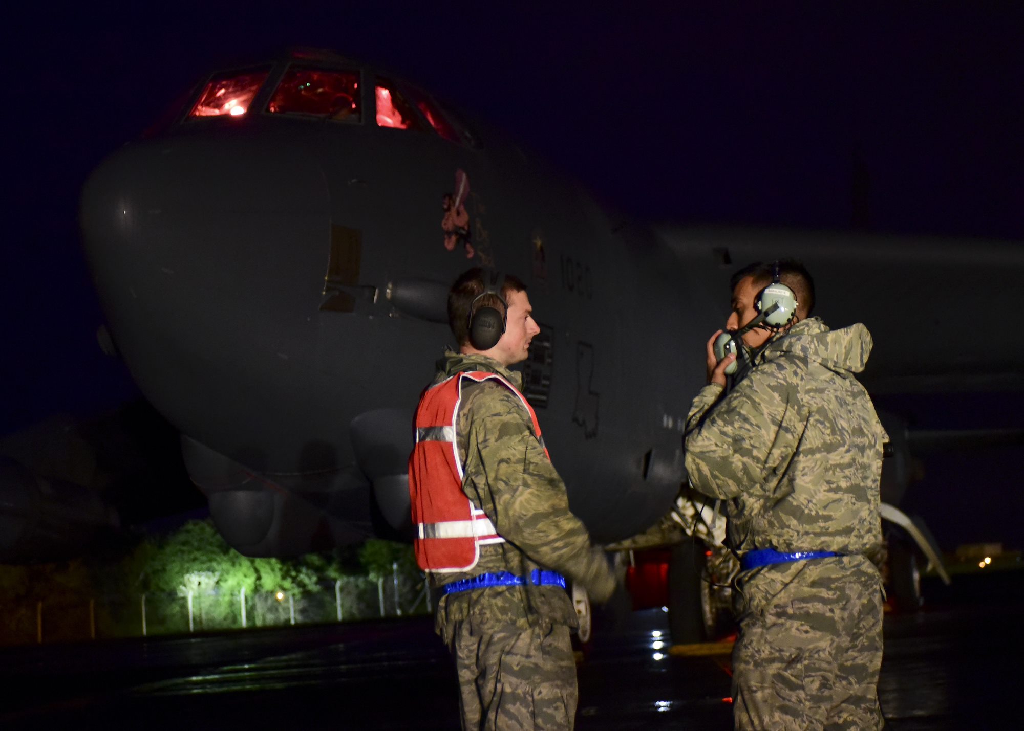 U.S. Air Force Senior Airmen Blake Nickells, right, and Alexander Dones, 2nd Aircraft Maintenance Squadron assistant dedicated crew chiefs, conduct pre-flight inspections on a B-52H Stratofortress at RAF Fairford, U.K., June 6, 2017. Exercises such as BALTOPS enable bomber crews to maintain a high state of readiness and proficiency and validate the bomber’s always-ready global strike capability. (U.S. Air Force photo by Airman 1st Class Randahl J. Jenson)