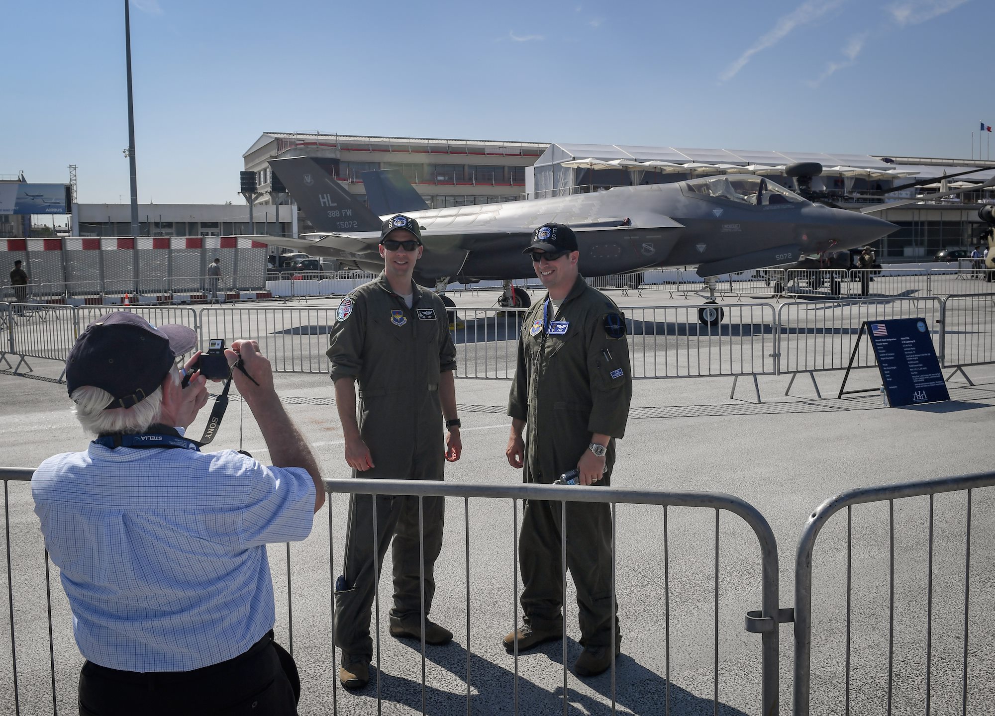 F-35A Lighting II pilots from Hill Air Force Base, Utah, pose for a photo in the U.S. corral at the Paris Air Show June 20, 2017 at Le Bourget, France. Aside from the F-35, the U.S. is displaying an F-16 Fighting Falcon, a CH-47 Chinook, an AH-64 Apache, a P-8 Poseidon, a C-130J Super Hercules and a CV-22 Osprey. The Paris Air Show offers the U.S. a unique opportunity to display their leadership in aerospeace and technology on an international scale. (U.S. Air Force photo/ Tech. Sgt. Ryan Crane)