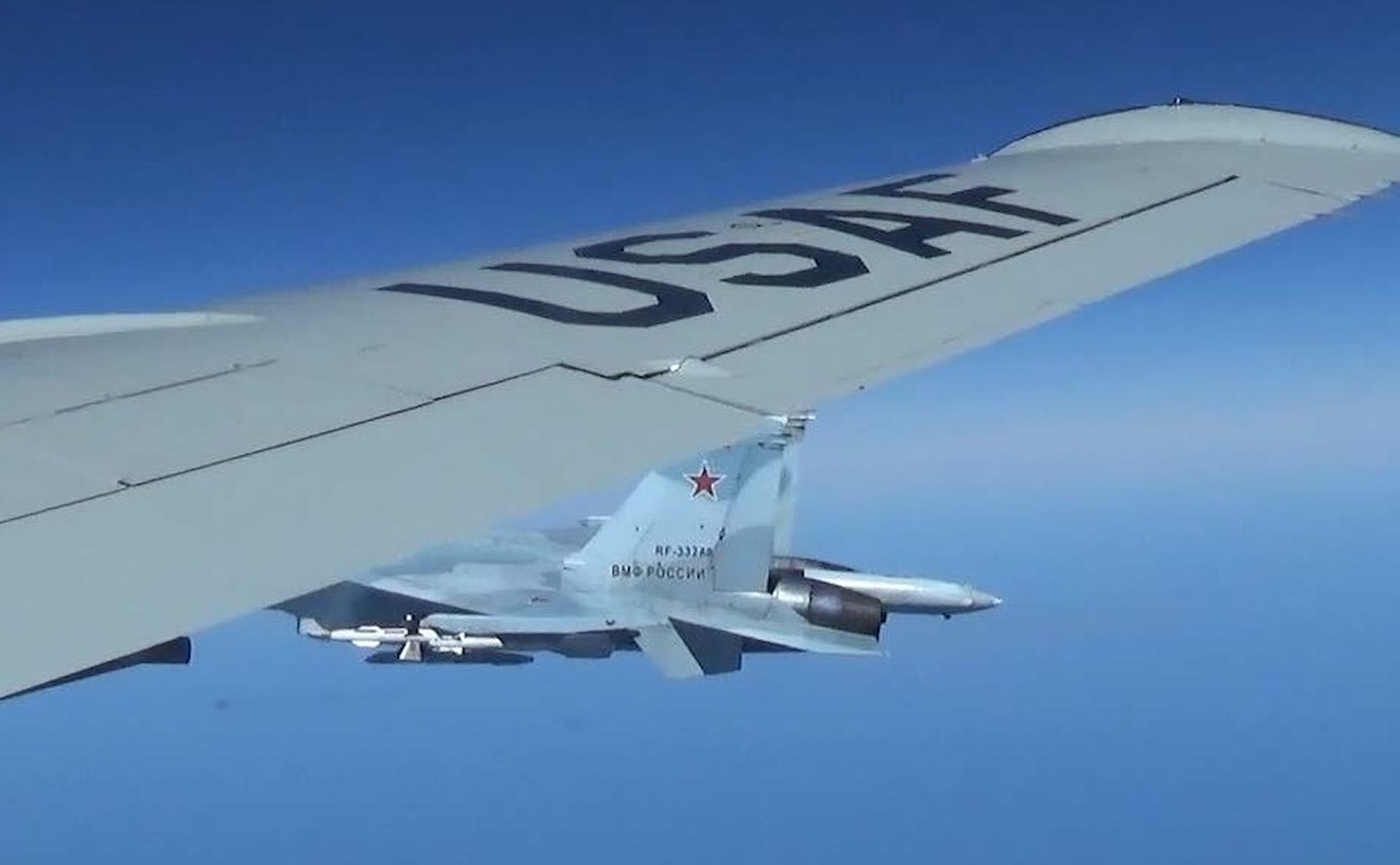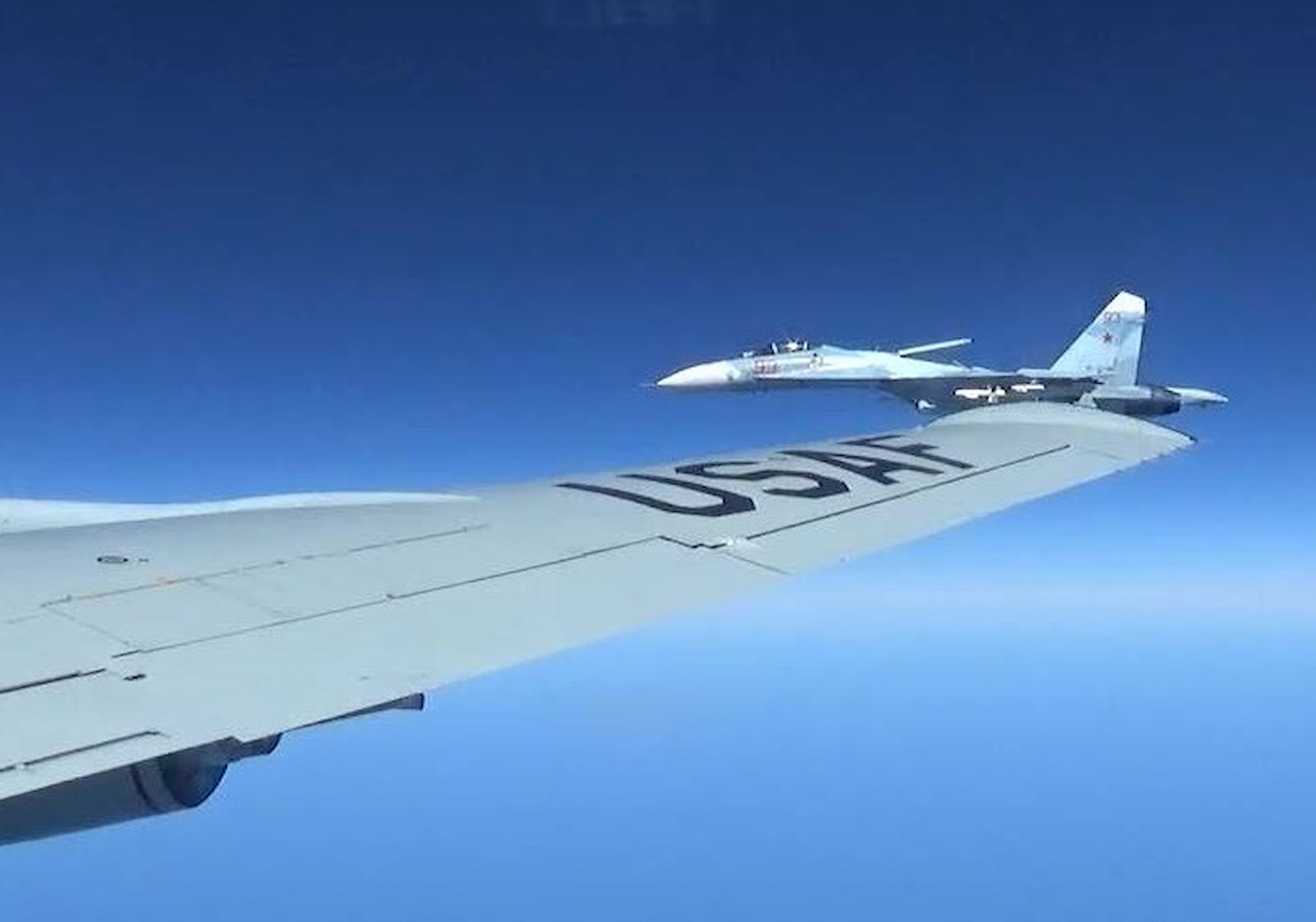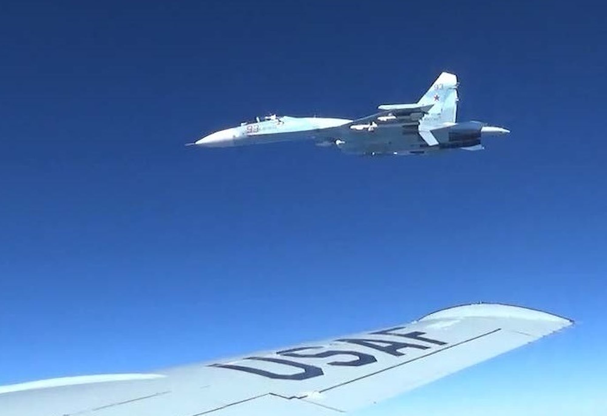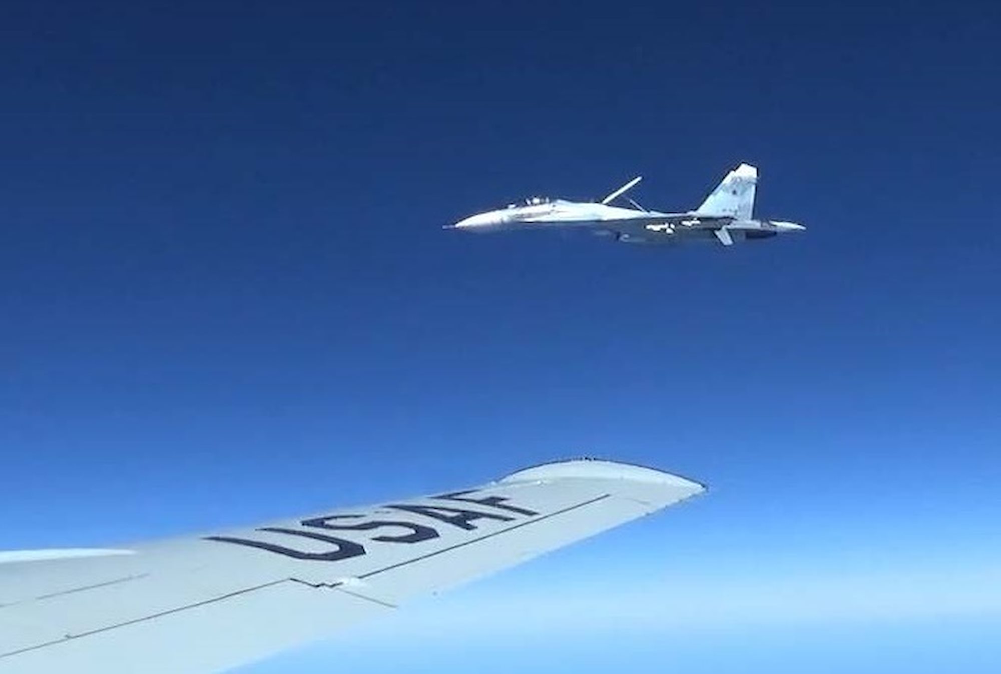 A U.S. RC-135U flying in international airspace over the Baltic Sea was intercepted by a Russian SU-27 Flanker June 19, 2017. Due to the high rate of closure speed and poor control of the aircraft during the intercept, this interaction was determined to be unsafe. (Courtesy photos/Released)