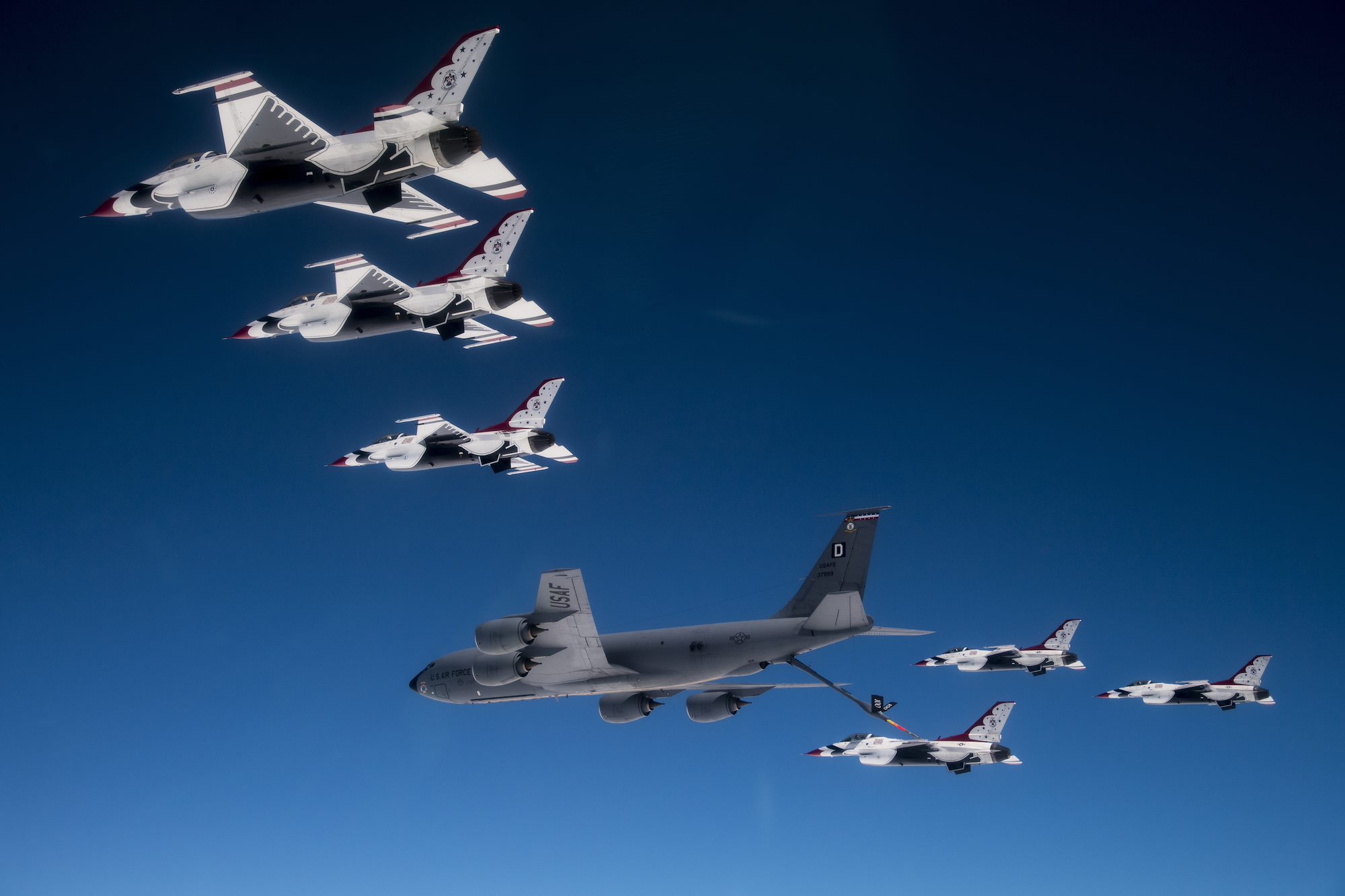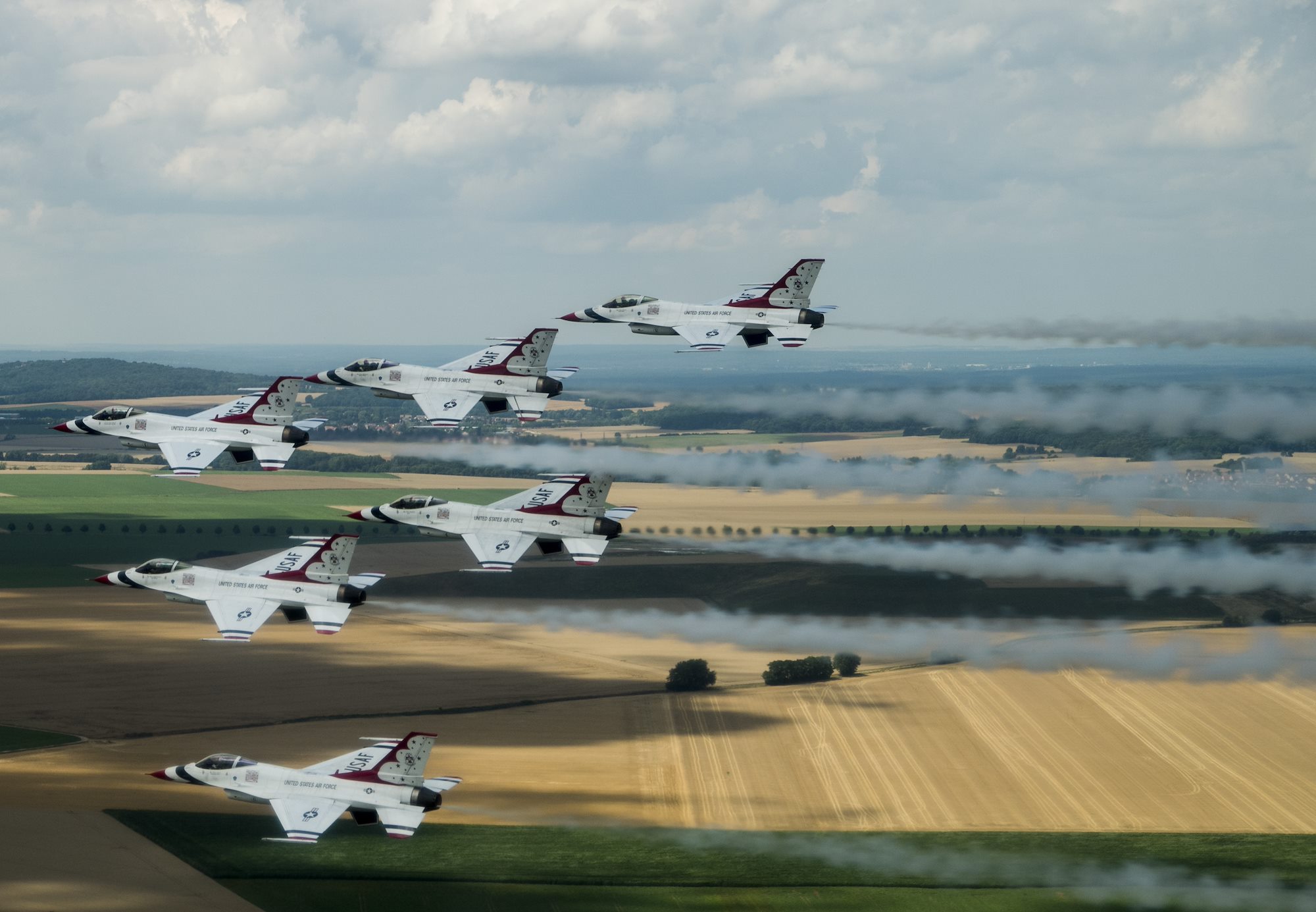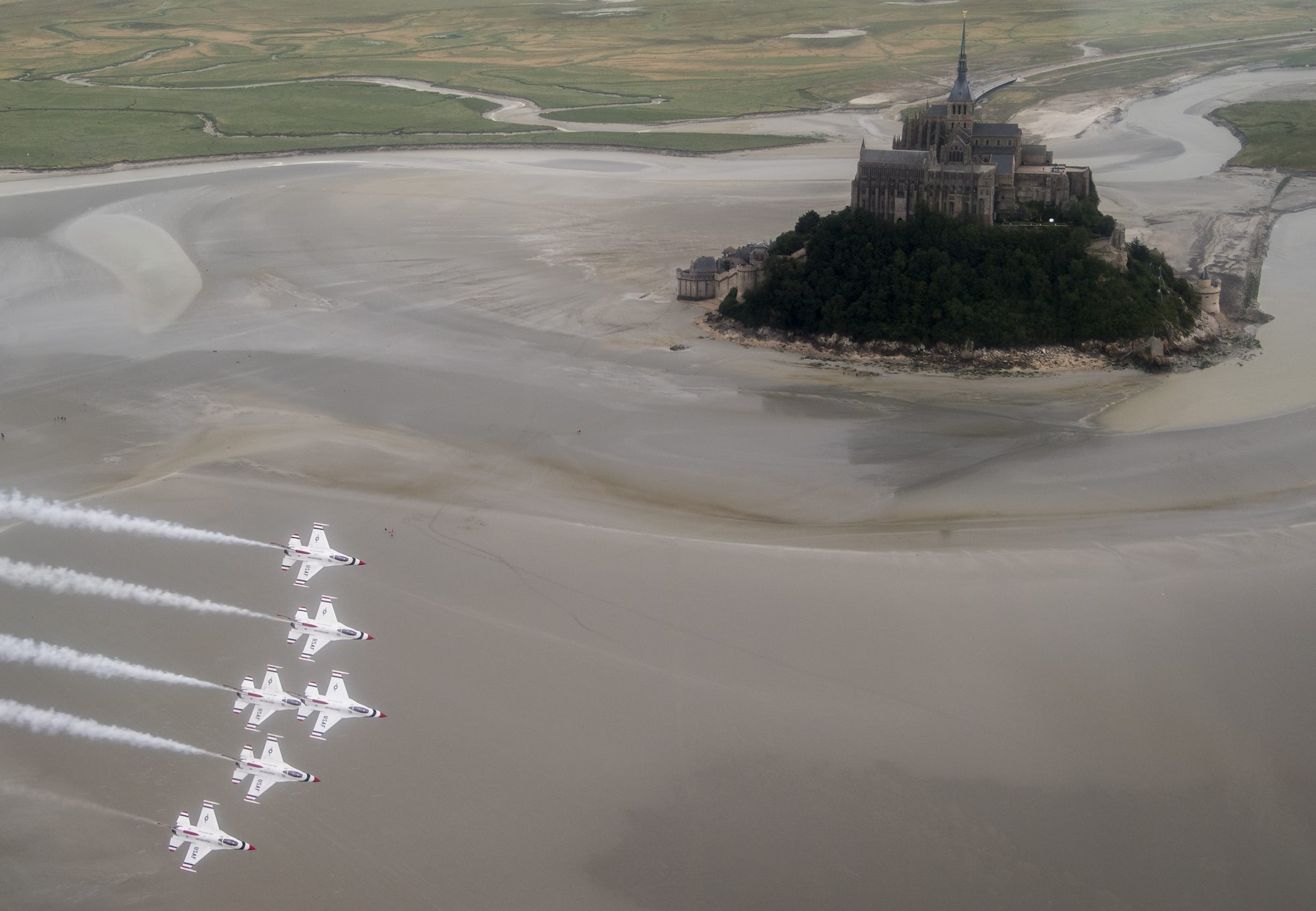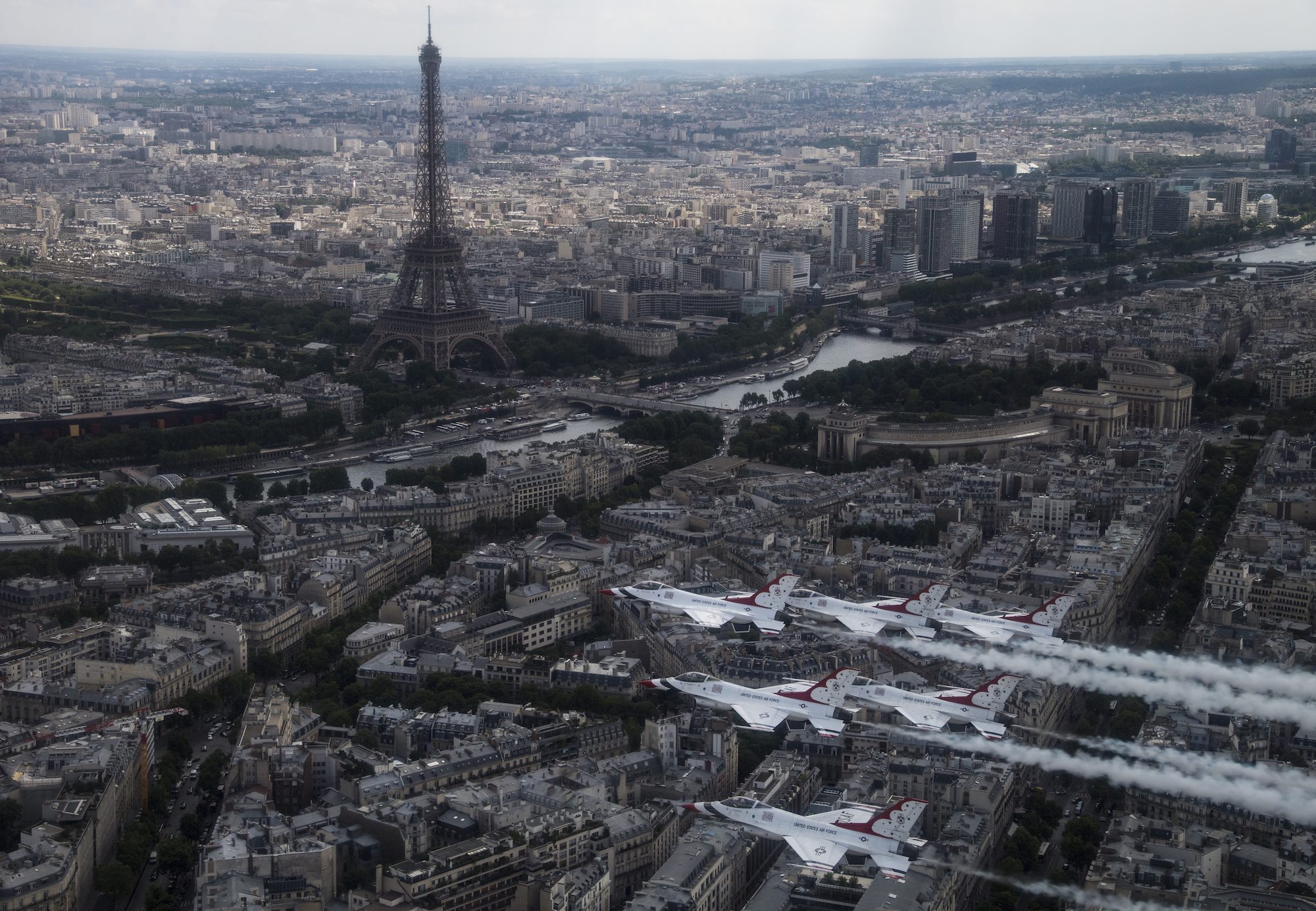 The U.S. Air Force Thunderbirds fly by the Eiffel Tower during a practice procession in Paris, France, July 11, 2017. The Thunderbirds, along with more than 90 aircraft, will be in attendance to help France celebrate the 2017 Bastille Day festivities. (U.S. Air Force Photo by Tech. Sgt. Christopher Boitz)