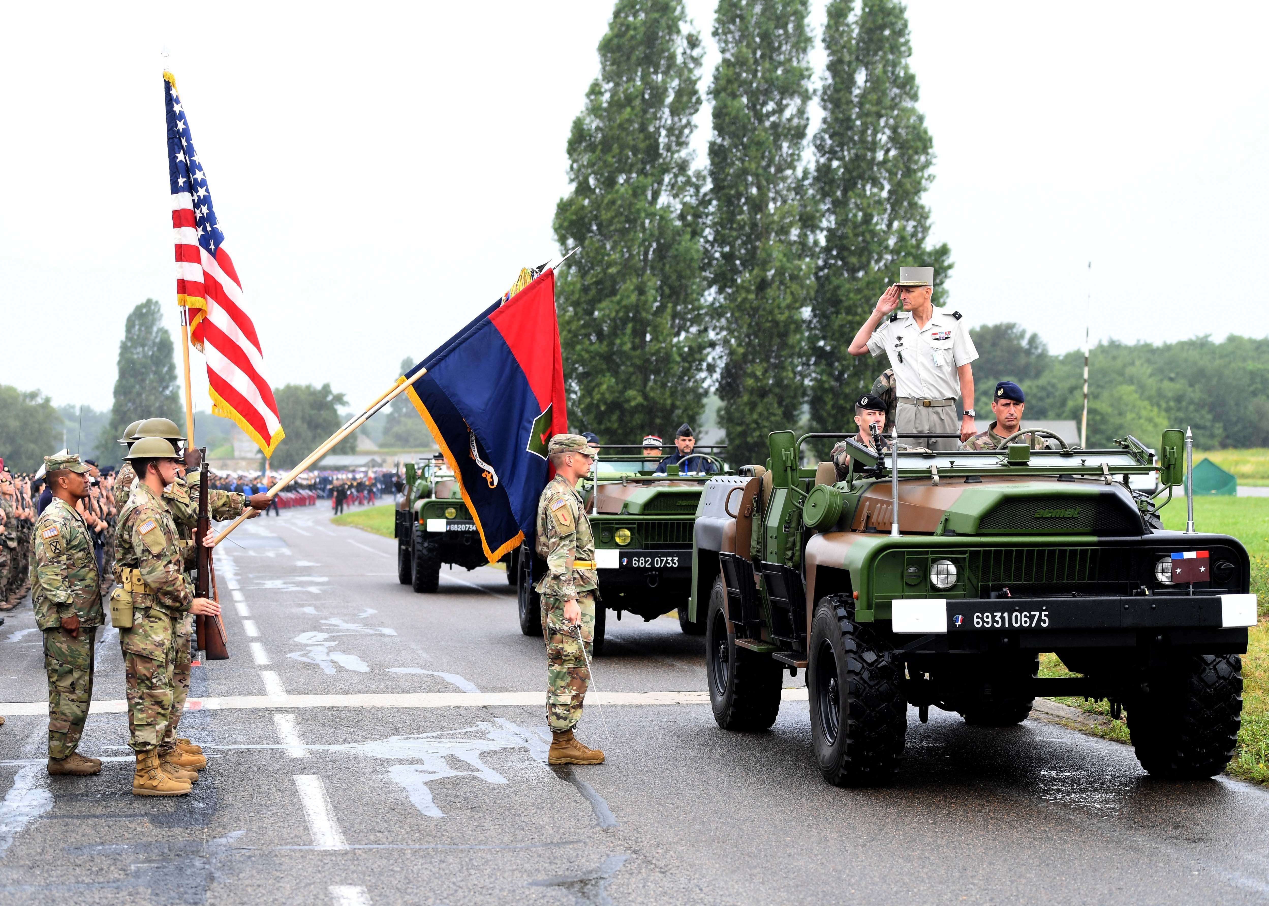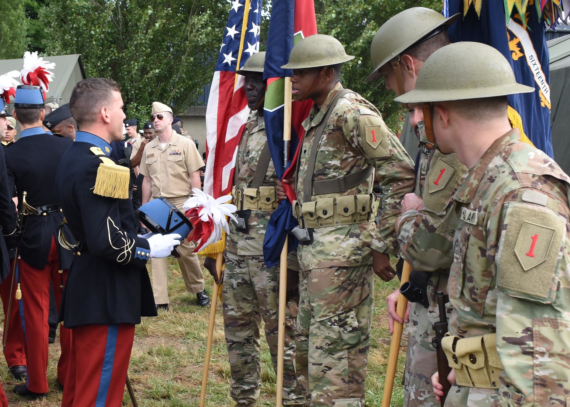 170712-N-AC979-431 SATORY, France (July 12, 2017) U.S. Soldiers from1st Infantry Division meet a French service member during a break in rehearsal for the Military Parade on Bastille Day to be held in Paris, France, July 14, 2017. A U.S. formation consisting of almost 200 Soldiers, Sailors, Marines and Airmen, most of them assigned to units in Europe, will lead this year’s parade as the country of honor in commemoration of the centennial of U.S. entry into World War I – as well as the long-standing partnership between France and the U.S. (U.S. Navy photo by Chief Mass Communication Specialist Michael McNabb/Released)