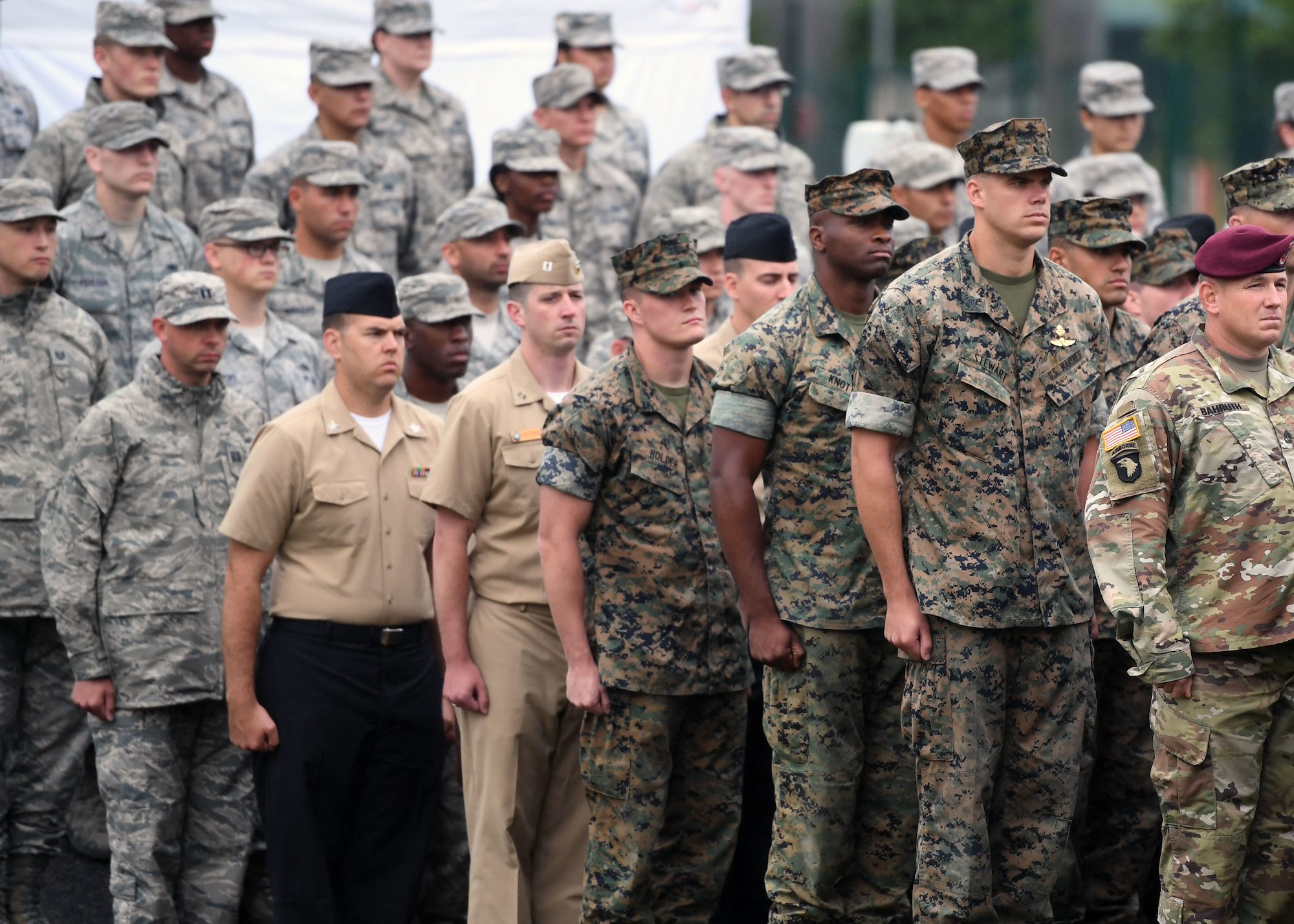 PARIS (July 12, 2017) Almost 200 U.S. Soldiers, Sailors, Marines and Airmen assigned to units in Europe and the 1st Infantry Division, Fort Riley, Kansas, stand in ranks during a rehearsal for the Military Parade on Bastille Day to be held July 14, 2017. This year, the U.S. will lead the parade as the country of honor in commemoration of the centennial of U.S. entry into World War I – as well as the long-standing partnership between France and the U.S. (U.S. Navy photo by Chief Mass Communication Specialist Michael McNabb/Released)