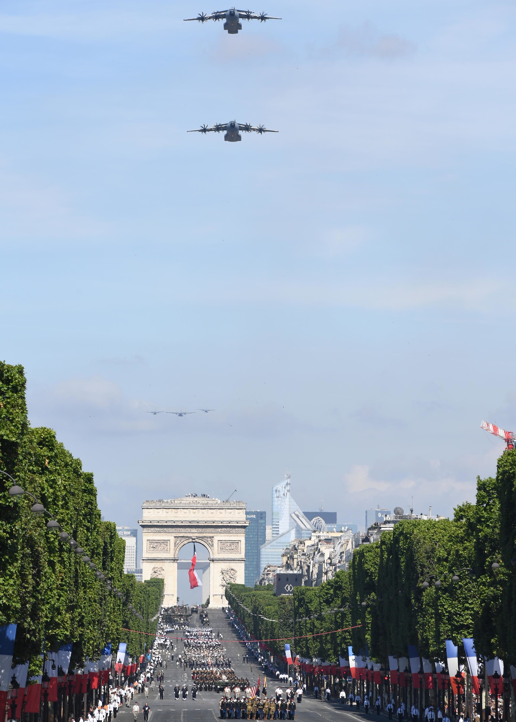 In all, this year’s parade included more than 3,700 participants and flyovers by the U.S. Air Force Thunderbirds; two F-22 Raptors; nine French Alpha Jets streaming blue, white and red contrails; and two French C-135s. For the commander of U.S. troops, Army Maj. Jared Nichols, assigned to the 1st Infantry Division, the honor of participating was made even more special by the fact his great-grandfather served on the Western Front in France during WWI.