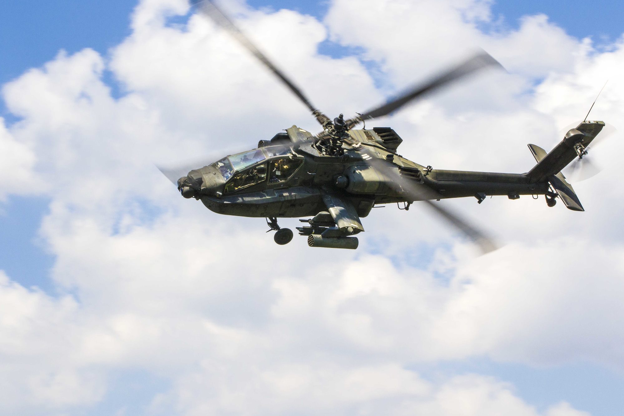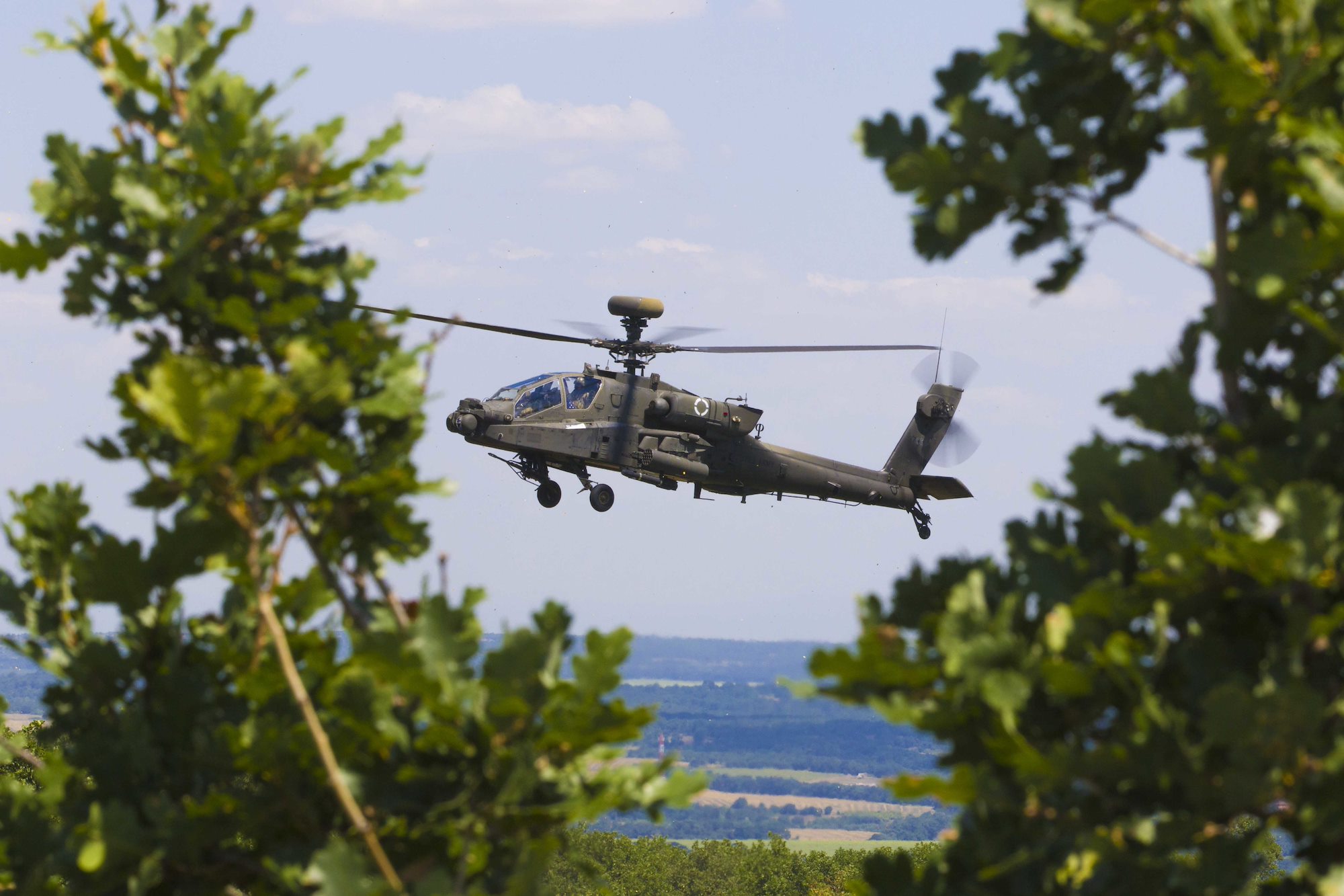 An AH-64 Apache helicopter from C Company, 1-501st Attack Reconnaissance Battalion, Task Force Falcon, 10th Combat Aviation Brigade, flies towards an objective during a combined live fire exercise titled Peace Sentinel at Koren, Bulgaria, on July 19. Exercise Saber Guardian 17 is a U.S. European Command, U.S. Army Europe-led exercise in the Black Sea Region that builds readiness and improves interoperability among the 20 Allies who participate. (U.S. Army photo by Spc. Thomas Scaggs) 170717-A-TZ475-412