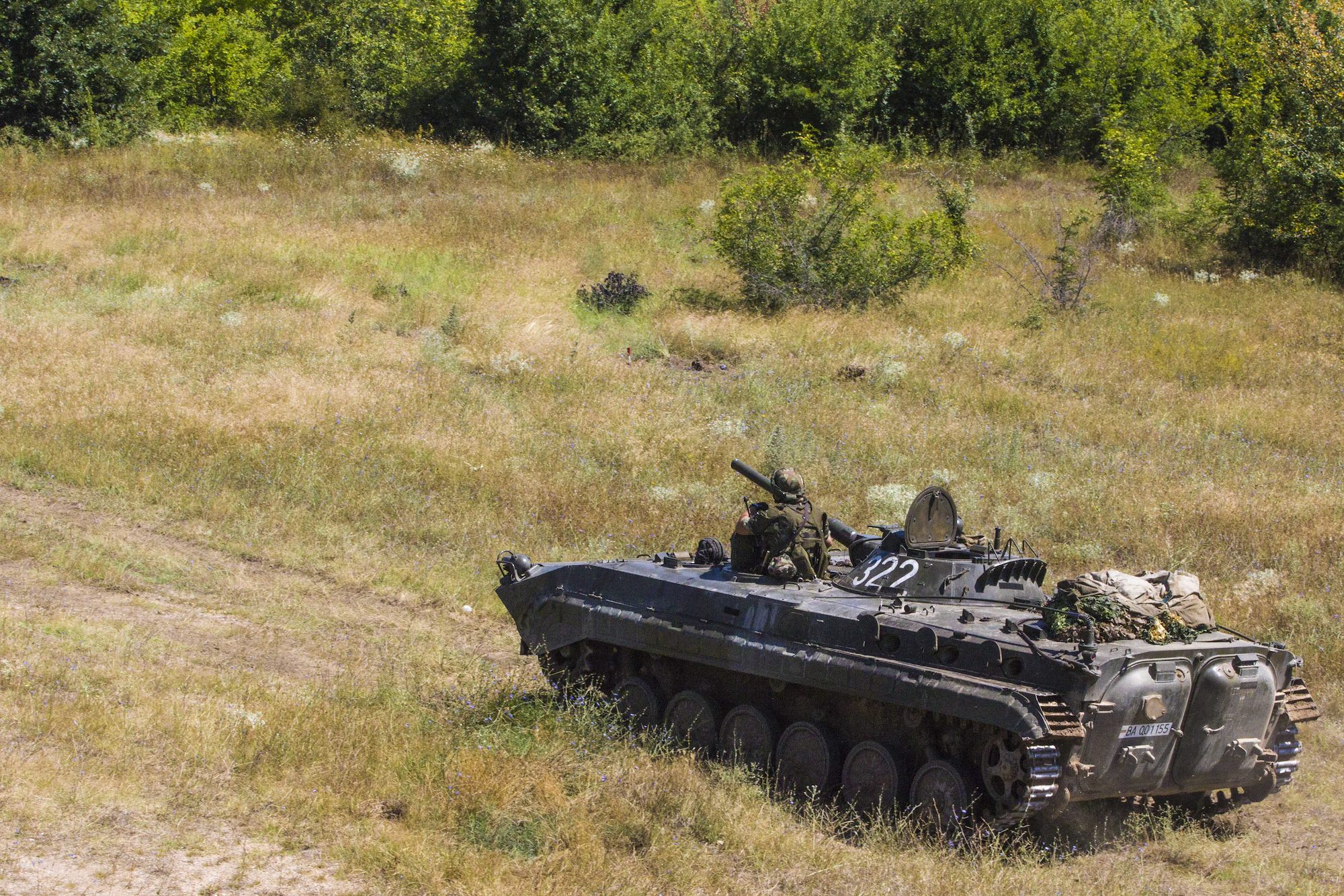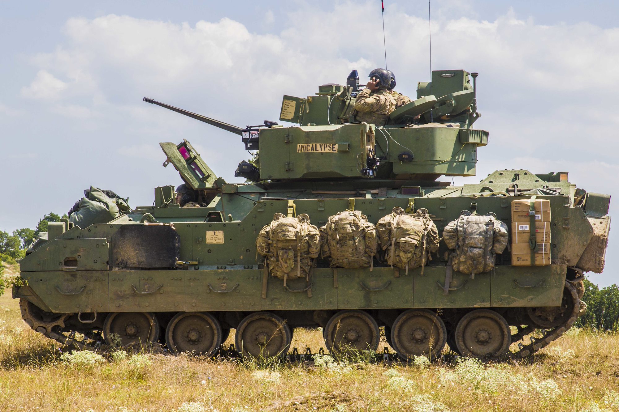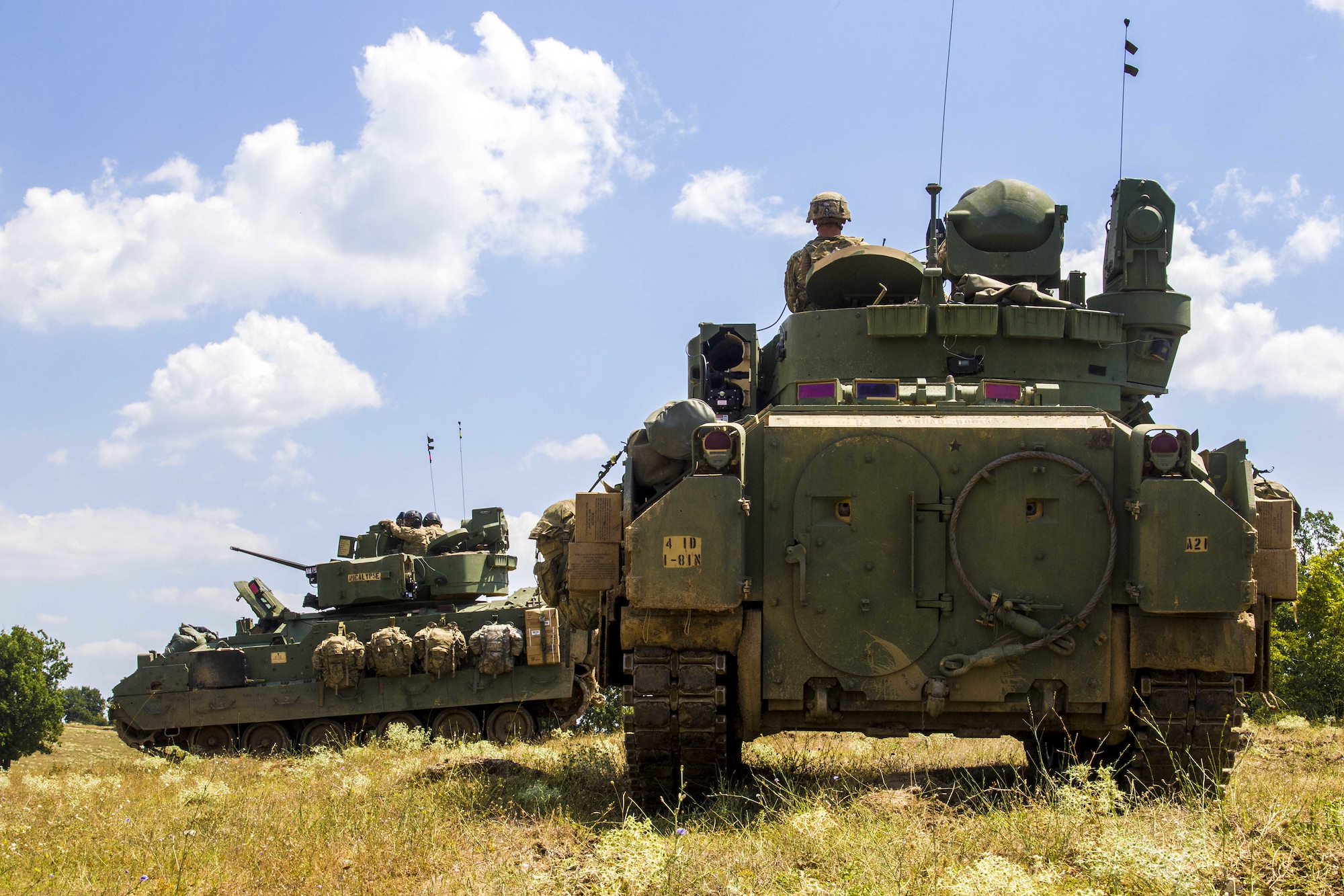 A Bradley Fighting Vehicle from 1st Battalion, 8th Infantry Regiment, 4th Infantry Division, defends a position during a combined live fire exercise titled Peace Sentinel at Koren, Bulgaria, on July 19. Exercise Saber Guardian 17 is a U.S. European Command, U.S. Army Europe-led exercise in the Black Sea Region that builds readiness and improves interoperability among the 20 Allies who participate. (U.S. Army photo by Spc. Thomas Scaggs) 170717-A-TZ475-443