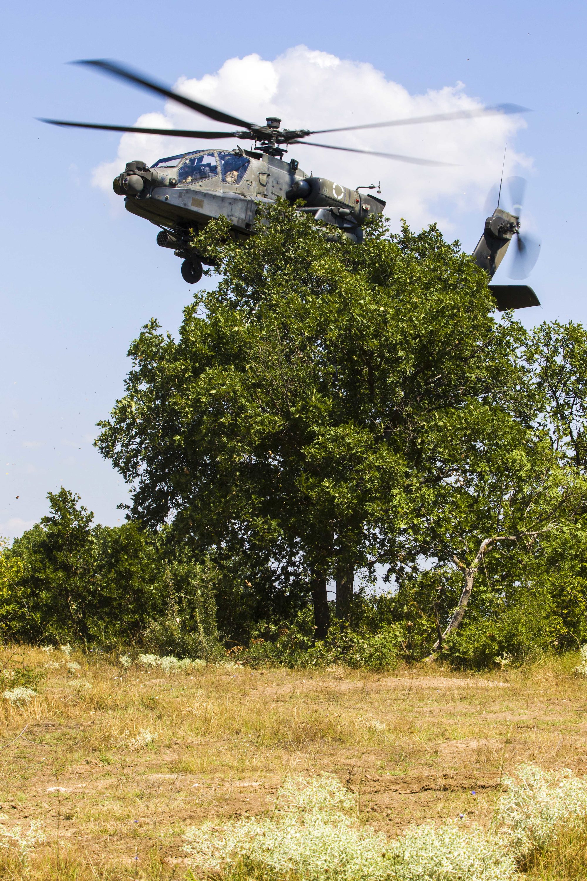 An AH-64 Apache helicopter from C Company, 1-501st Attack Reconnaissance Battalion, Task Force Falcon, 10th Combat Aviation Brigade, hovers during a combined live fire exercise titled Peace Sentinel at Koren, Bulgaria, on July 17. Exercise Saber Guardian 17 is a U.S. European Command, U.S. Army Europe-led exercise in the Black Sea Region that builds readiness and improves interoperability among the 20 Allies who participate. (U.S. Army photo by Spc. Thomas Scaggs) 170717-A-TZ475-396