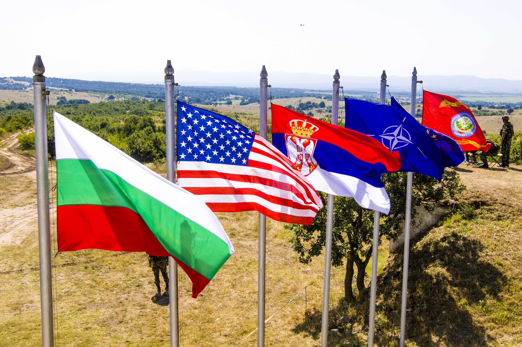 A line of flags at a training area in Koren, Bulgaria, on July 19 during exercise Peace Sentinel, a combined arms live fire exercise between Bulgarian Land Forces, 4th Infantry Division, and 10th Combat Aviation Brigade, as part of a larger exercise. Exercise Saber Guardian 17 is a U.S. European Command, U.S. Army Europe-led exercise in the Black Sea Region that builds readiness and improves interoperability among the 20 Allies who participate. (U.S. Army photo by Spc. Thomas Scaggs) 170717-A-TZ475-123