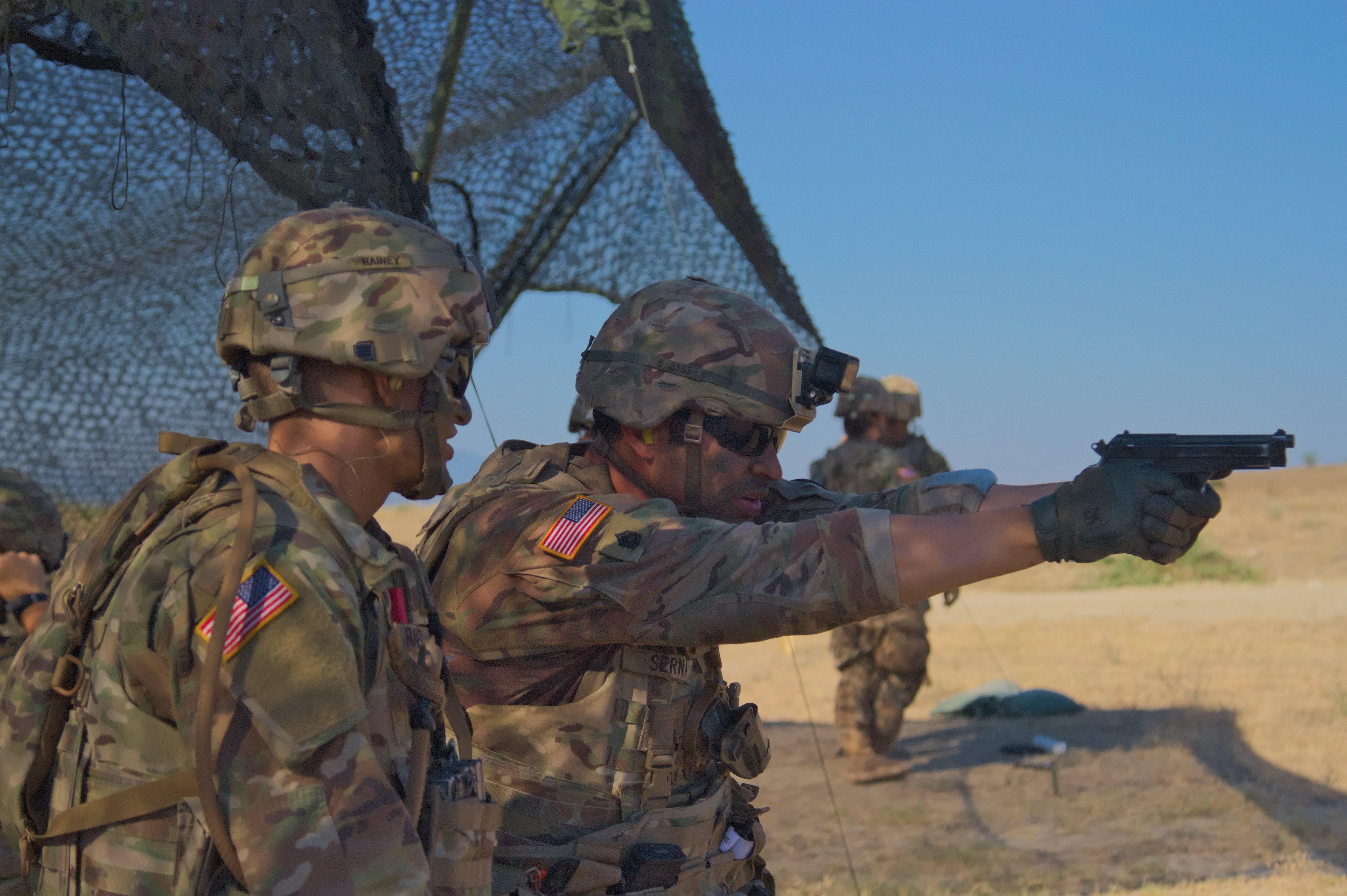 U.S. Army Staff Sgt. Joshua Serna, a platoon sergeant with the 110th Military Police Company, currently attached to the Regimental Engineering Squadron, 2nd Cavalry Regiment, gives some pointers to U.S. Army Spc. Jordan Rainey, a medic with medic platoon, Headquarters and Headquarters Troop, Regimental Engineering Squadron, 2nd Cavalry Regiment, about firing his M9 Beretta pistol during a firing range at Krivolak Training Area, Macedonia on August 1, 2017. The Regimental Engineering Squadron is currently working in Macedonia as a part of Dragoon Guardian, an offshoot of Operation Atlantic Resolve, which is a NATO mission involving the US and Allied and partnered nations in Europe to enhance regional stability and to deter aggression. (Photo by Army Pfc. Nicholas Vidro, 7th Mobile Public Affairs Detachment)