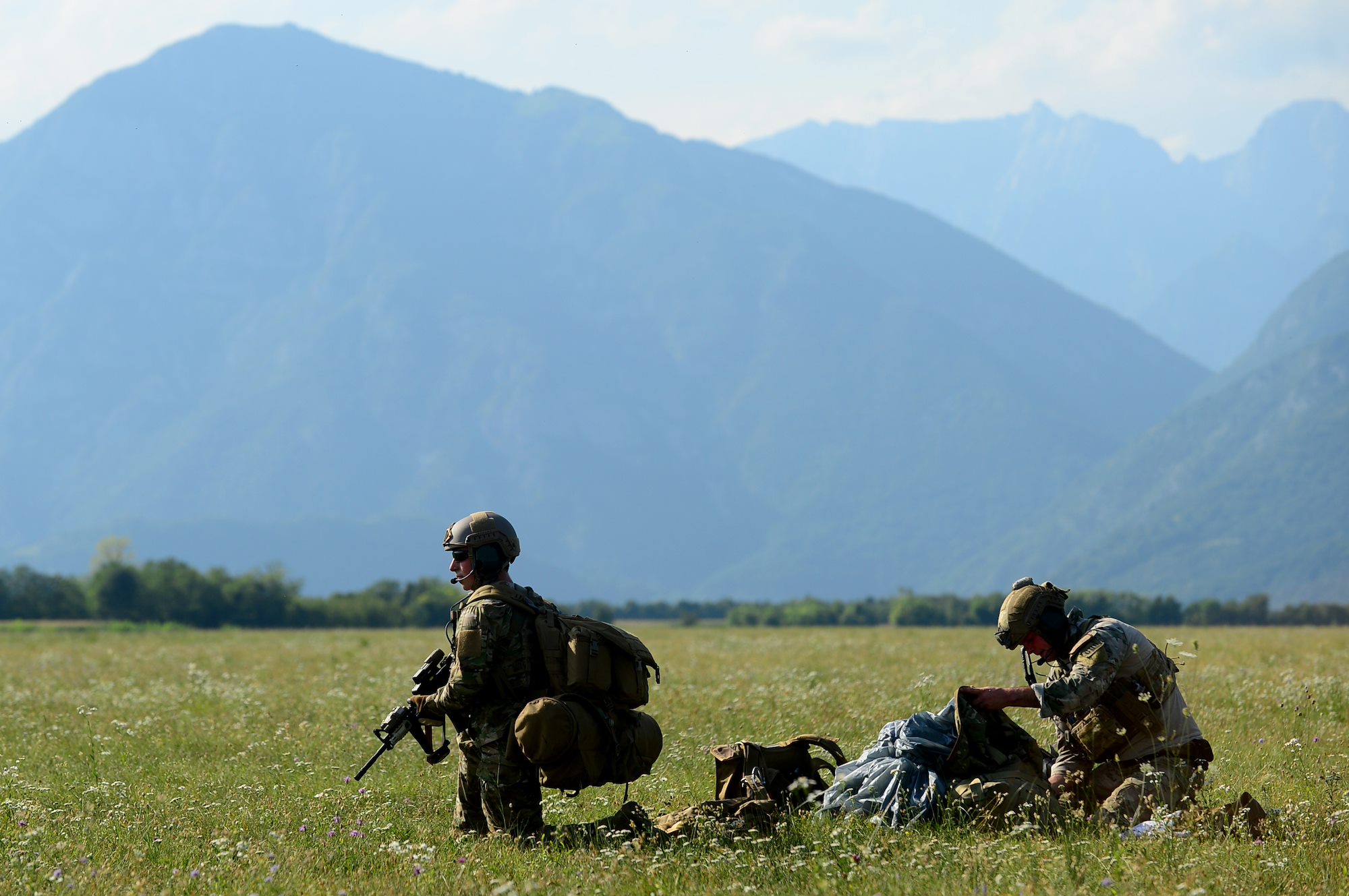 Airmen assigned to the 57th Rescue Squadron regroup after a freefall jump during exercise Ares Shadow near Aviano, Italy, Aug. 9. The 57th RQS is scheduled to move to Aviano Air Base in the summer of 2018. (U.S. Air Force photo/Airman 1st Class Eli Chevalier)