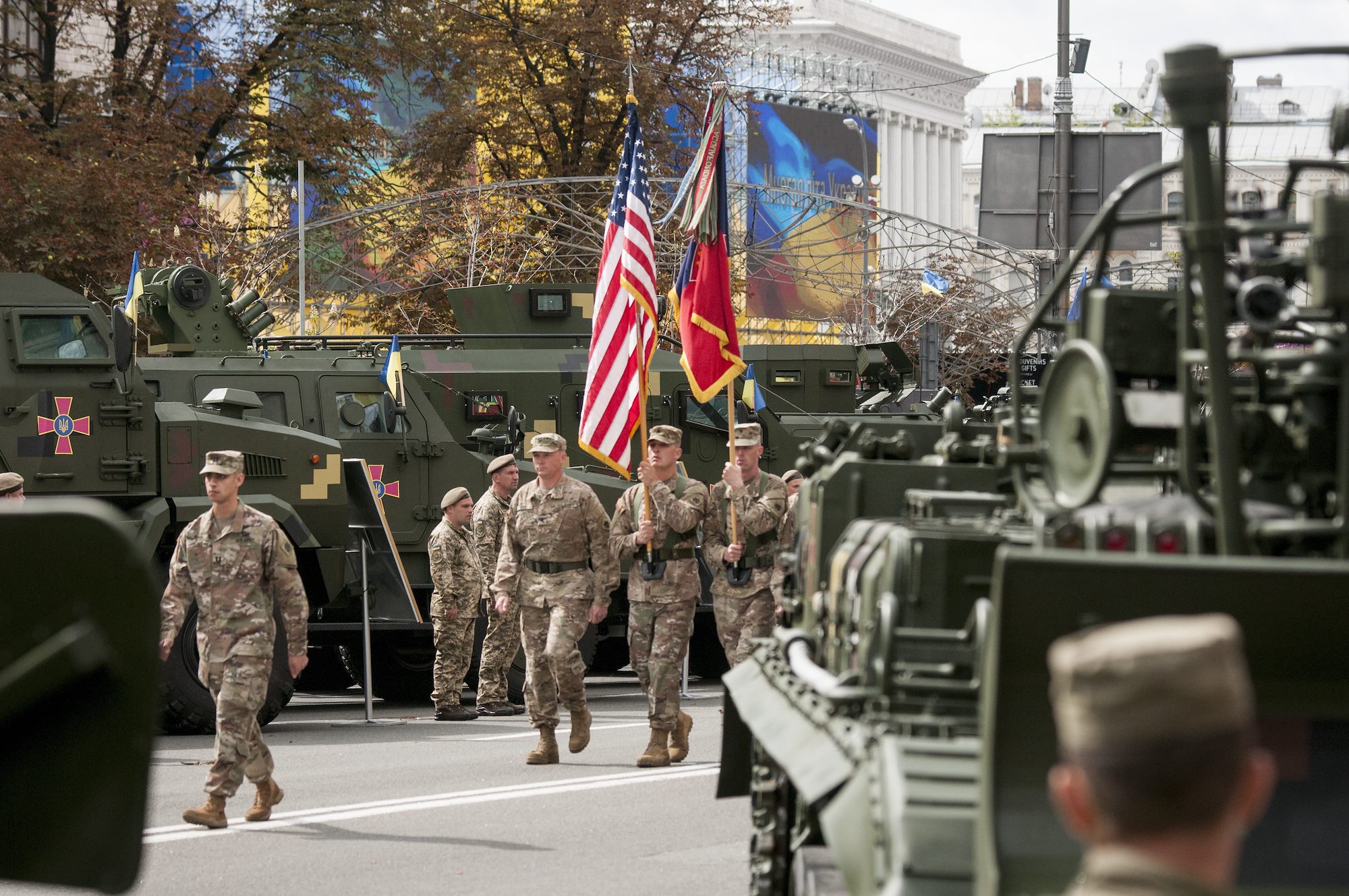 Oklahoma National Guard Soldiers from the 45th Infantry Brigade Combat Team march alongside Ukrainian troops and other NATO allies and partners during a parade in Kyiv, Ukraine on Aug. 24, to celebrate Ukrainian independence.