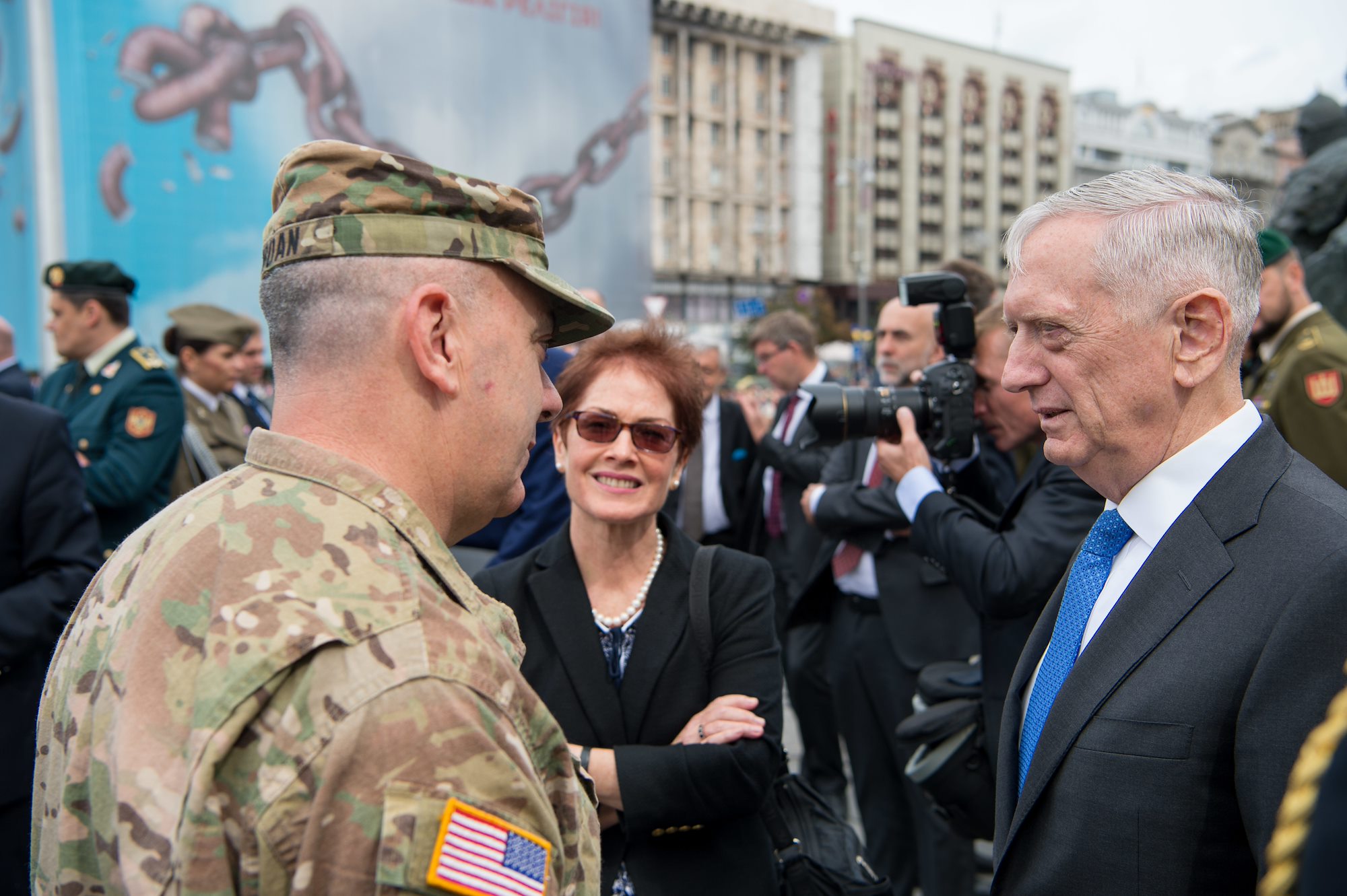 Secretary of Defense Jim Mattis and U.S. Ambassador to Ukraine Marie Yovanovitch speak to the commander of the U.S Army's 45th Infantry Brigade Combat Team, Col. David Jordan in Kyiv, Ukraine, on Aug. 24, 2017.