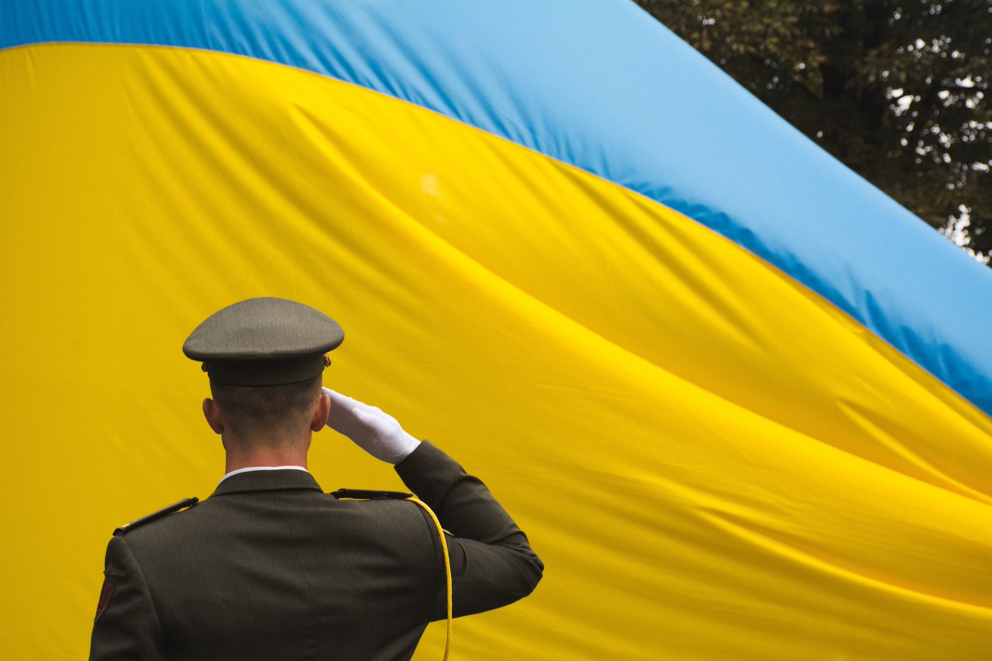 A Ukrainian soldier salutes his country's flag during a Ukrainian Independence Day celebration in Yavoriv, Ukraine, on Aug. 24. (Photo by Spc. Samuel Mason, 45th Infantry Brigade Combat Team)