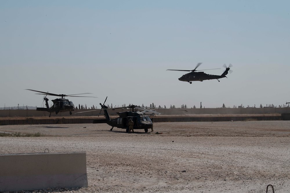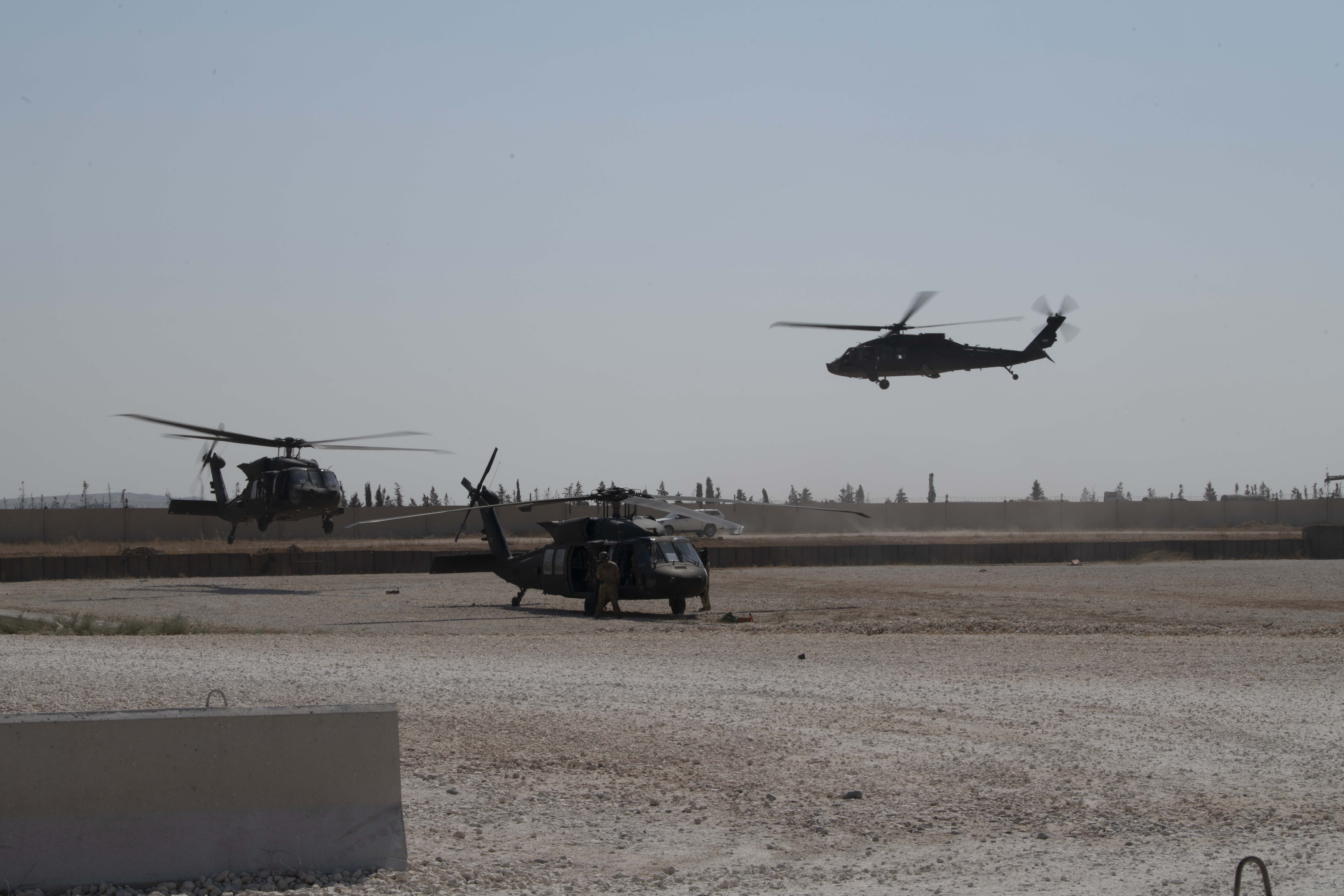 U.S. Army UH-60 Black Hawks take off for a joint aerial patrol of the security mechanism zone with Turkish military helicopters in northeast Syria, Sept. 5, 2019. The security mechanism is intended to secure and stabilize the Turkey-Syria border in a sustainable manner, ensure campaign continuity in the Global Coalition's efforts to defeat Daesh, and limit any uncoordinated military operations. The security mechanism will be executed in designated phases and in a coordinated and combined manner to ensure security and stability along the Turkey-Syria border. (U.S. Army photo by Spc. Alec Dionne)