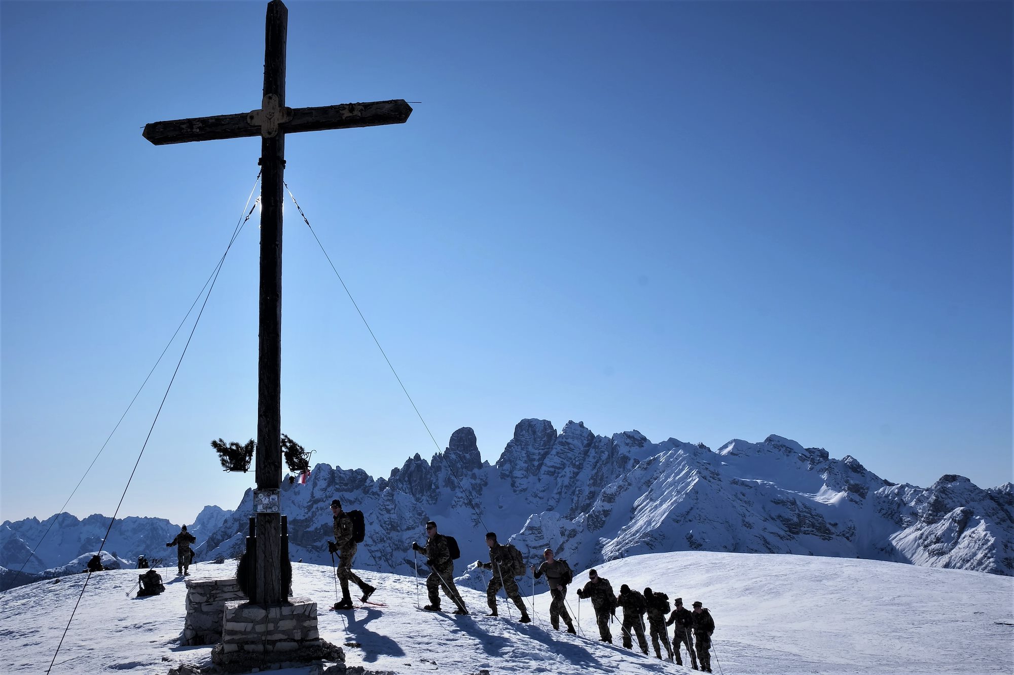 After 90 minutes of continuous climbing up the slope in stark sunlight and a cloudless blue sky, the Soldiers of the 2500th DLD arrived at a wooden cross marking the peak of Monte Specie at more than 7,545 feet.