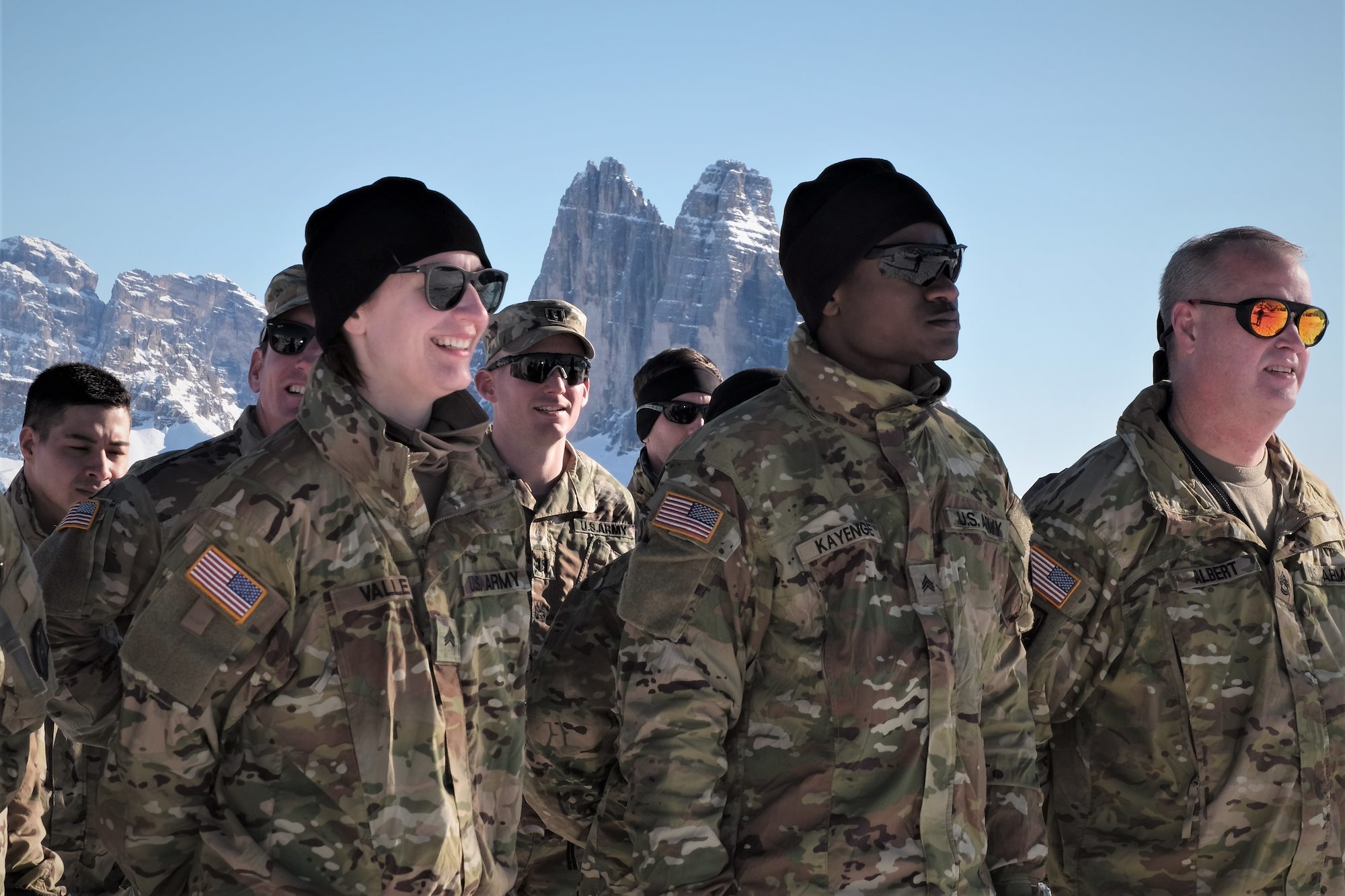 U.S. Army Reserve Soldiers from the 2500th Digital Liaison Detachment, 7th Mission Support Command, pose for a photo at the peak of Monte Specie while conducting search, rescue and recovery training with three alpine instructors from the Italian Army´s 6th Alpine Regiment during exercise Alpine Rock in Toblach, Italy, January 10-12, 2020. Fifteen Soldiers from the 2500th participated in the winter survival training that emphasized small-unit tactical interoperability.