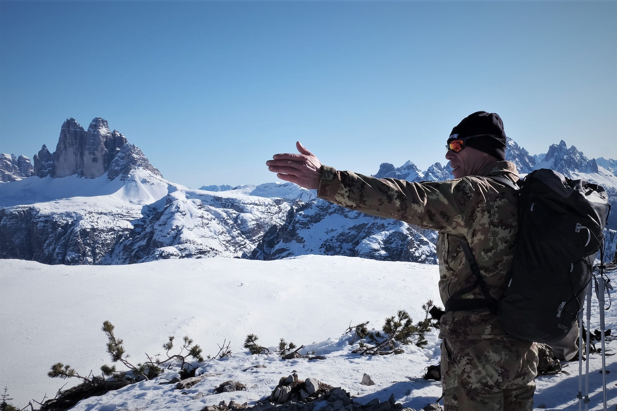 Italian Army Luogotenente Ewald Beikircher, commander of the Ski and Climbing Platoon, 79th Company, 6th Alpine Regiment, points out the former border between Austria and Italy while leading U.S. Army Reserve Soldiers from the 2500th Digital Liaison Detachment, 7th Mission Support Command, on a summit of Monte Specie during search, rescue and recovery training in Toblach, Italy, January 10-12, 2020. Fifteen Soldiers from the 2500th participated in the winter survival training that emphasized small-unit tactical interoperability.