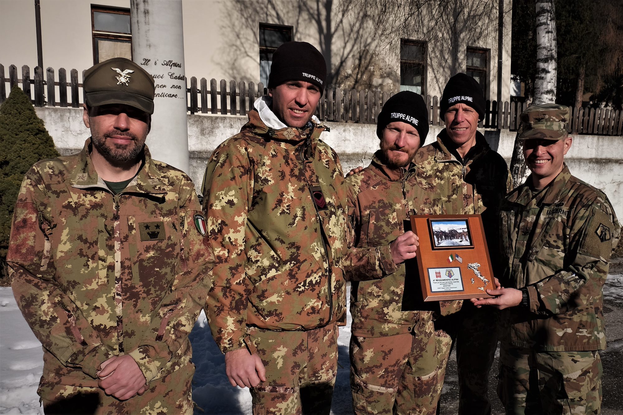 U.S. Army Reserve Col. Gregory E. Gimenez (right), commander of the 2500th Digital Liaison Detachment, 7th Mission Support Command, presents a unit friendship plaque (from left) to Tenente Colonello Stefano Bertinotti, commander of the Italian Army´s 6th Alpine Regiment, Caporal Maggiore Capo Thomas De Toni, Caporal Maggiore Capo Matteo Lovat, and Luogotenente Ewald Beikircher, of the Ski and Climbing Platoon, 79th Company, 6th Alpine Regiment, in appreciation after the conclusion of exercise Alpine Rock in Toblach, Italy, January 12, 2020. Fifteen Soldiers from the 2500th participated in the winter survival training that emphasized small-unit tactical interoperability.