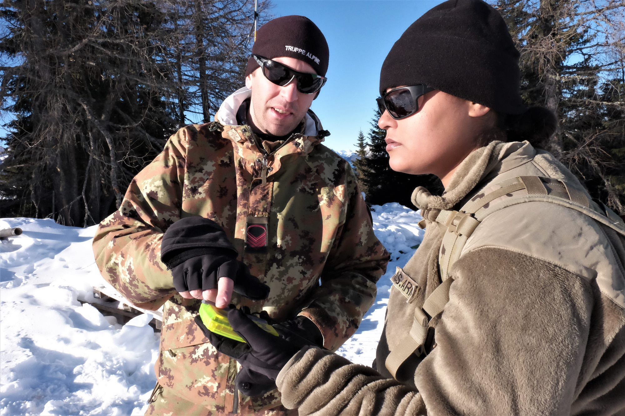 U.S. Army Reserve Sgt. Lara R. Dasilva, a supply sergeant with the 2500th Digital Liaison Detachment, 7th Mission Support Command, and Caporal Maggiore Capo Thomas De Toni, an Italian Army instructor with the Ski and Climbing Platoon, 79th Company, 6th Alpine Regiment, use a Pieps avalanche beacon to locate a notional avalanche victim for winter survival training during exercise Alpine Rock in Toblach, Italy, January 11, 2020. Fifteen Soldiers from the 2500th participated in the winter survival training that emphasized small-unit tactical interoperability.