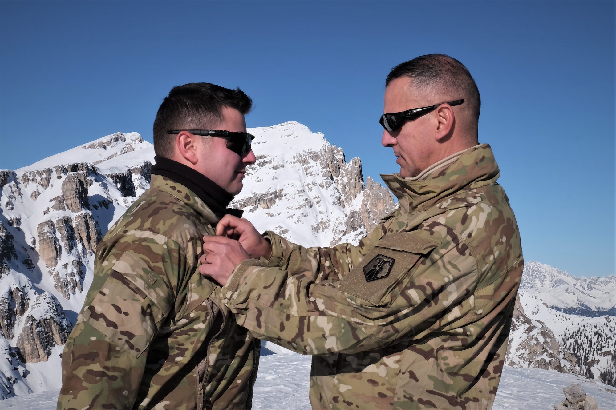 U.S. Army Reserve Lt. Col. Cory D. Poppe, 2500th Digital Liaison Detachment, 7th Mission Support Command, pins rank on Sgt. 1st Class Mark Jacobson, 2500th DLD, 7th MSC, in a mountain-top promotion ceremony after his unit used snowshoes to summit Monte Specie during winter survival training with the Italian Army´s 6th Alpine Regiment during exercise Alpine Rock in Toblach, Italy, January 11, 2020. Fifteen Soldiers from the 2500th participated in the winter survival training that emphasized small-unit tactical interoperability.