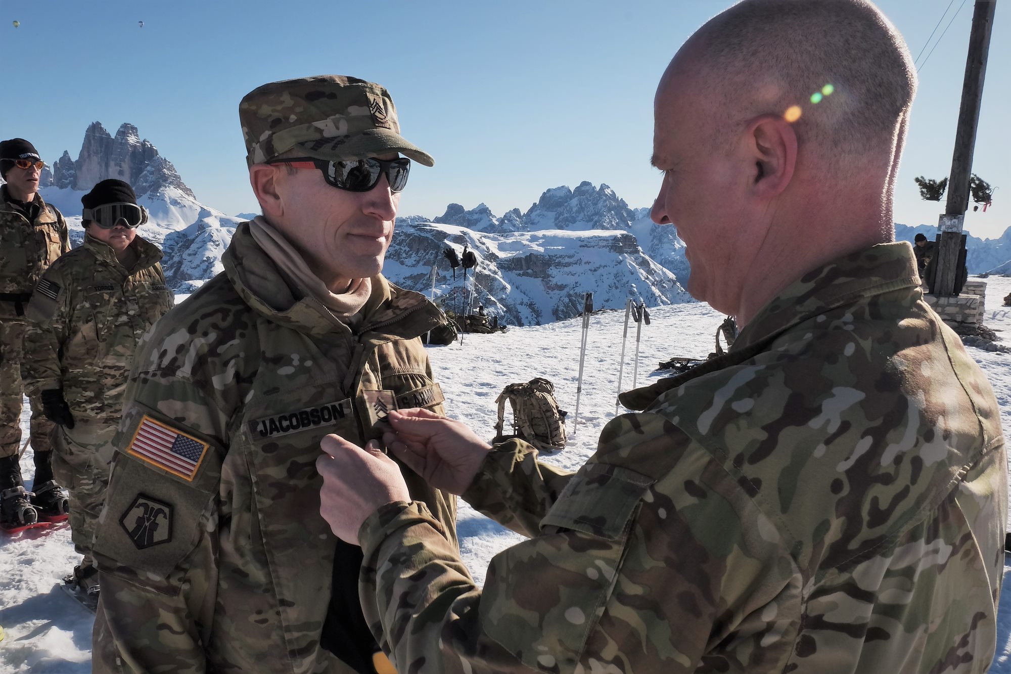 U.S. Army Reserve Master Sgt. Carlos Garcia, 2500th Digital Liaison Detachment, 7th Mission Support Command, pins rank on Staff Sgt. Wesley Cyrus, 2500th DLD, 7th MSC, in a mountain-top promotion ceremony after his unit used snowshoes to summit Monte Specie during winter survival training with the Italian Army´s 6th Alpine Regiment during exercise Alpine Rock in Toblach, Italy, January 11, 2020. Fifteen Soldiers from the 2500th participated in the winter survival training that emphasized small-unit tactical interoperability.