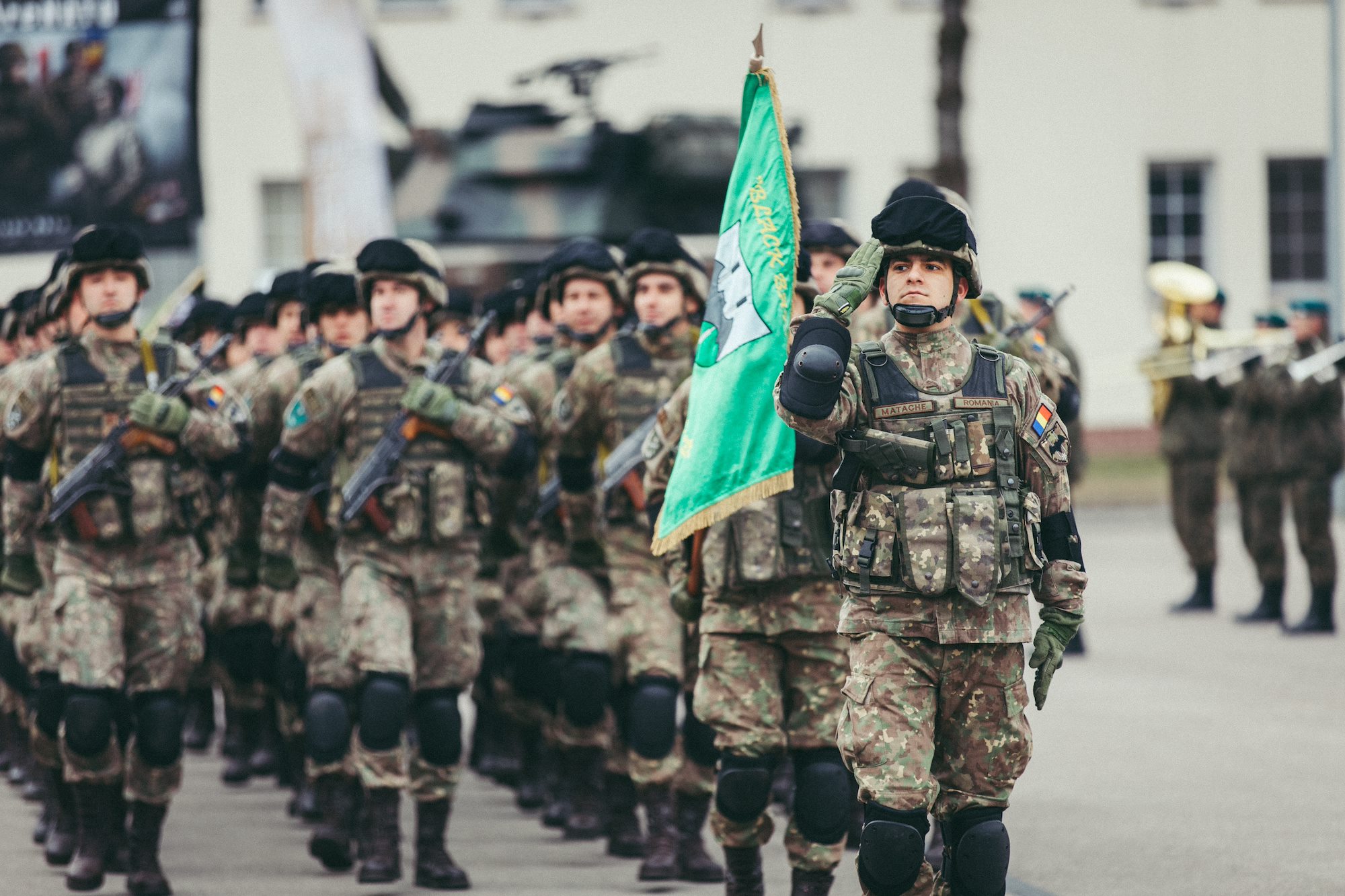 Romanian Soldiers, assigned to the Black Bats, 228th Air Defense Batallion, 2nd Mountain Troop Brigade, conduct a pass and review during a transfer of authority ceremony where U.S. Army Lt. Col. Andrew Gallo, commander assigned to the 3rd Squadron, 2d Cavalry Regiment, takes command of NATO's enhanced Forward Presence Battle Group Poland in Bemowo Piskie, Poland, Jan. 20, 2020. NATO’s enhanced Forward Presence consists of four battalion-sized battle groups deploying on a persistent rotational basis to Estonia, Latvia, Lithuania and Poland to demonstrate the alliance’s determination and ability to act as one in response to any aggression against its members. (U.S. Army photo by Sgt. Timothy Hamlin)