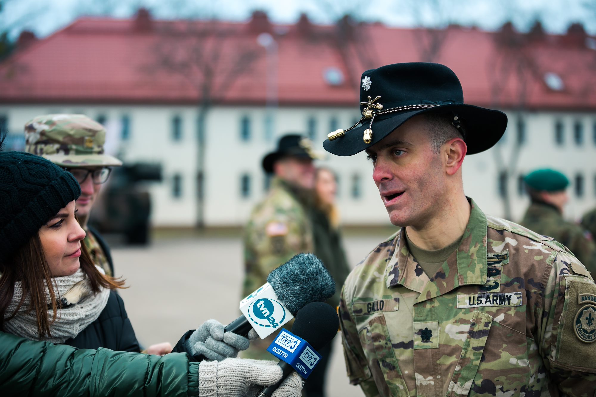U.S. Army Lt. Col. Andrew Gallo, (right) commander assigned to the 3rd Squadron, 2d Cavalry Regiment, conducts an interview with local media following the transfer of authority ceremony in which he took command of NATO's enhanced Forward Presence Battle Group Poland in Bemowo Piskie, Poland, Jan. 20, 2020. NATO’s enhanced Forward Presence consists of four battalion-sized battle groups deploying on a persistent rotational basis to Estonia, Latvia, Lithuania and Poland to demonstrate the alliance’s determination and ability to act as one in response to any aggression against its members. (U.S. Army photo by Sgt. Timothy Hamlin)