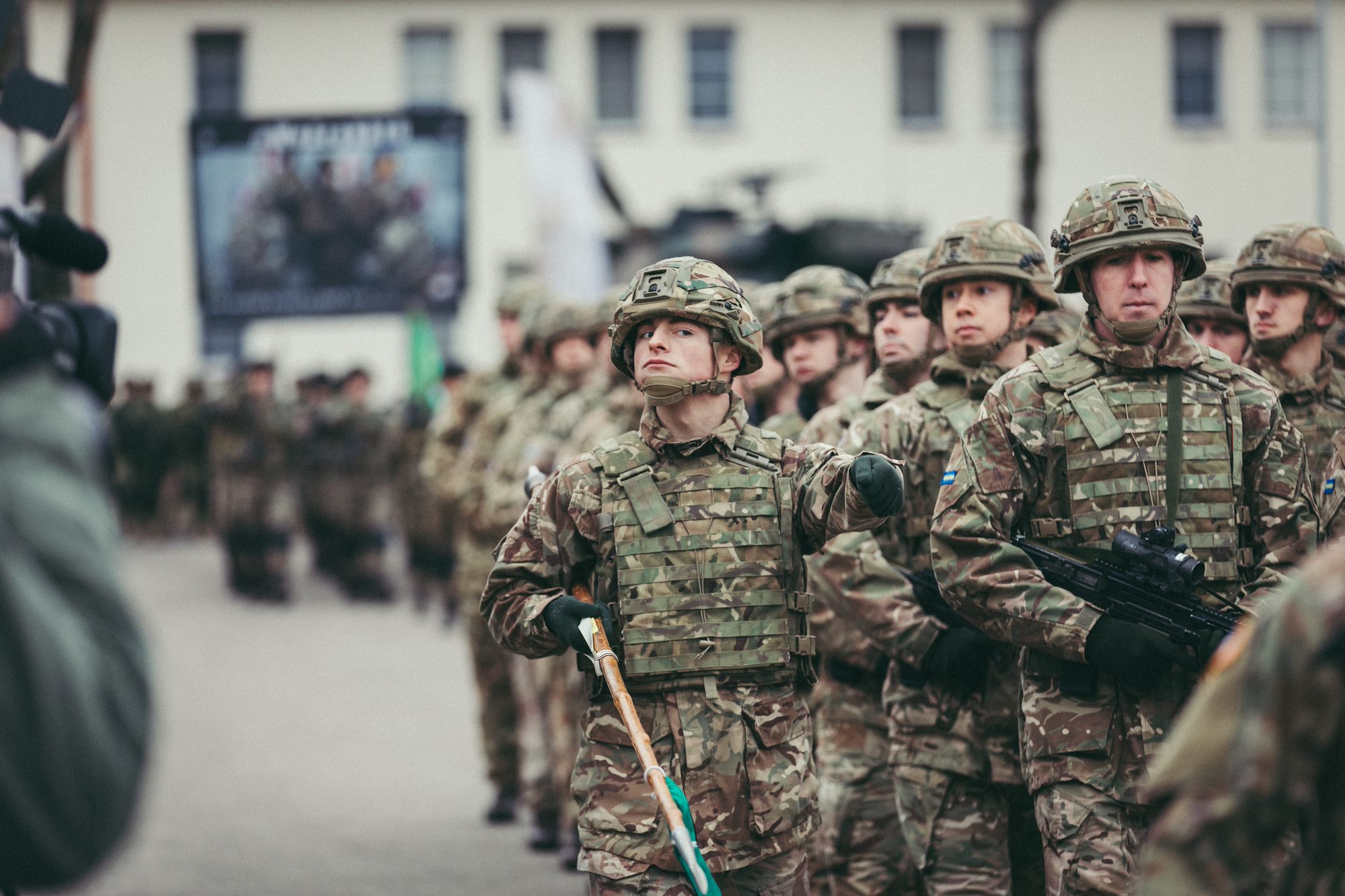 Soldiers from Poland, Croatia, Romania, United Kingdom and the United States stand in unison during a transfer of authority ceremony for the NATO's enhanced Forward Presence Battle Group Poland in Bemowo Piskie, Poland, Jan. 20, 2020. NATO’s enhanced Forward Presence consists of four battalion-sized battle groups deploying on a persistent rotational basis to Estonia, Latvia, Lithuania and Poland to demonstrate the alliance’s determination and ability to act as one in response to any aggression against its members. (U.S. Army photo by Sgt. Timothy Hamlin)