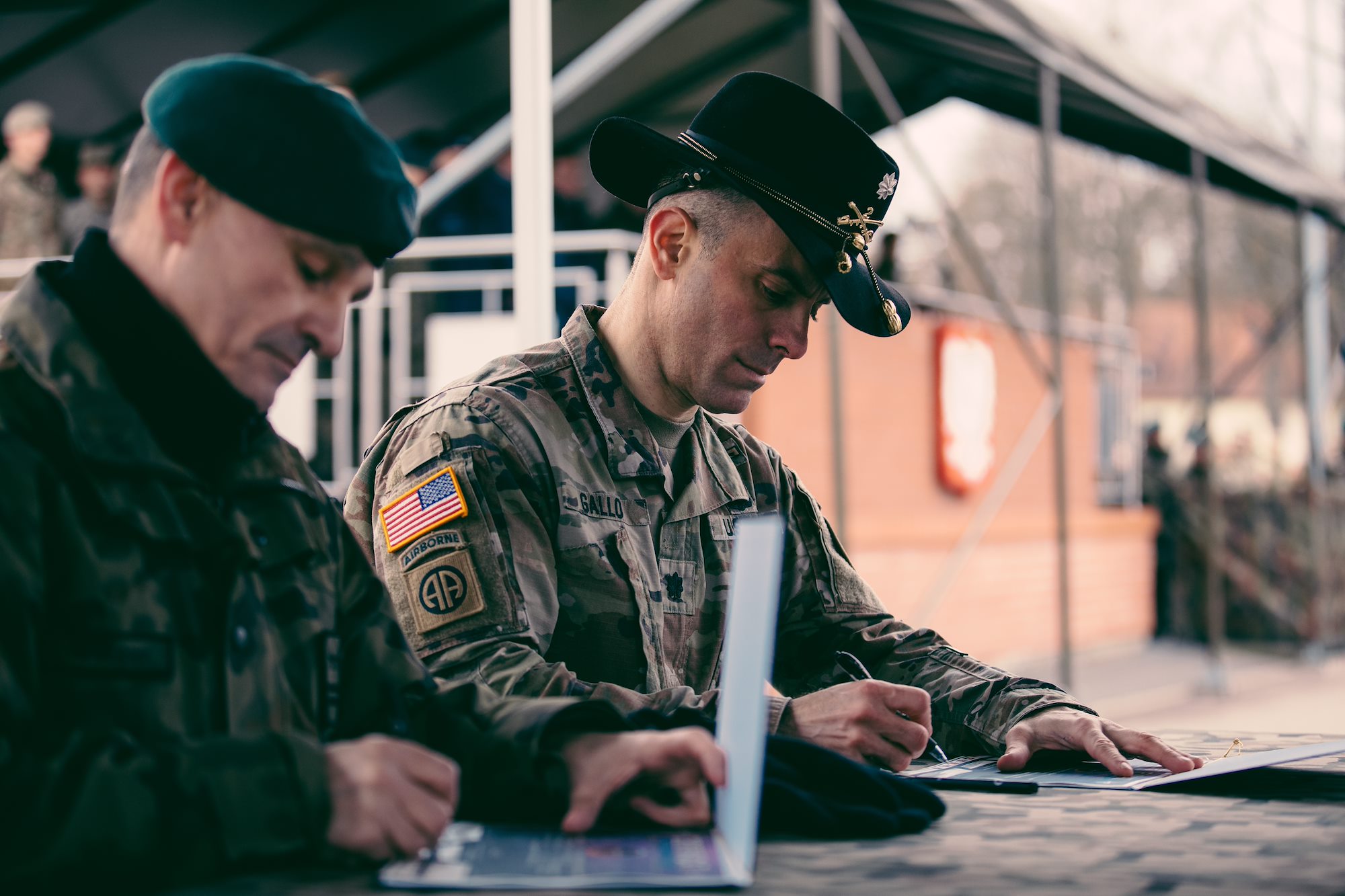 Polish Army Col. Bogdan Rycerski, (left) commander assigned to the 15th Mechanized Brigade, and U.S. Army Lt. Col. Andrew Gallo, (right) commander assigned to the 3rd Squadron, 2d Cavalry Regiment, ceremoniously sign over command of NATO's enhanced Forward Presence Battle Group Poland during a transfer of authority ceremony in Bemowo Piskie, Poland, Jan. 20, 2020. NATO’s enhanced Forward Presence consists of four battalion-sized battle groups deploying on a persistent rotational basis to Estonia, Latvia, Lithuania and Poland to demonstrate the alliance’s determination and ability to act as one in response to any aggression against its members. (U.S. Army photo by Sgt. Timothy Hamlin)