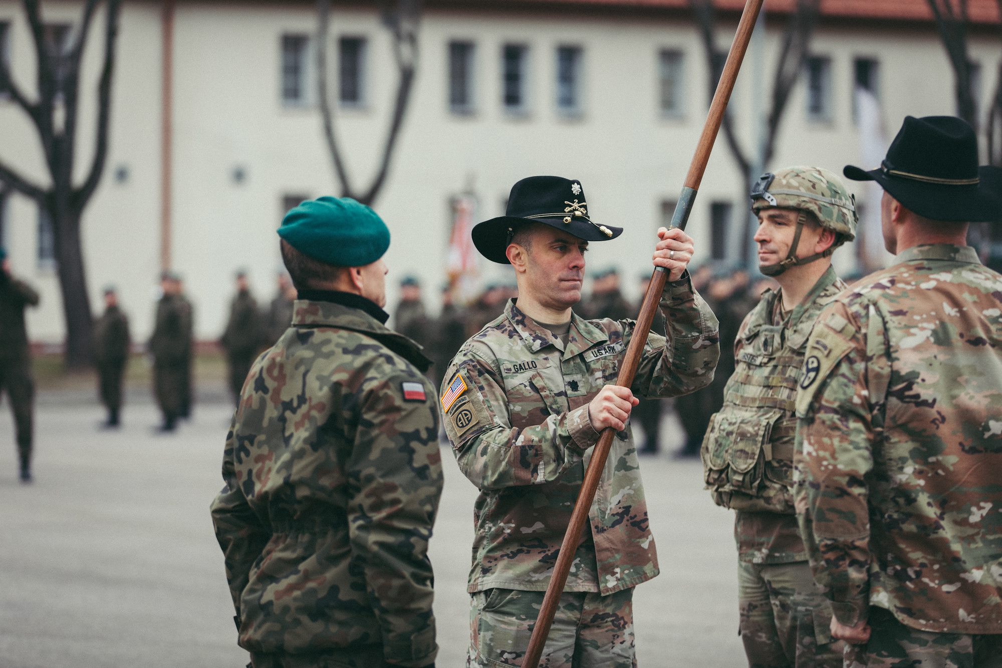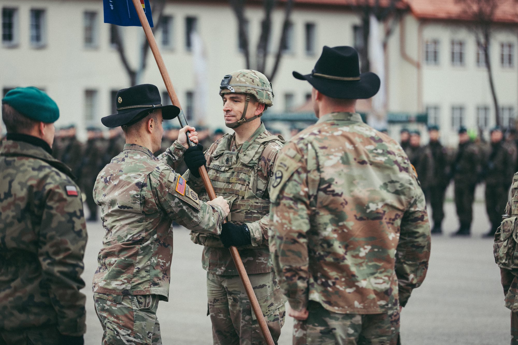 U.S. Army Lt. Col. Andrew Gallo, (center left) commander assigned to the 3rd Squadron, 2d Cavalry Regiment, hands off the NATO enhanced Forward Presence Battle Group Poland flag to Command Sgt. Maj. Marcus Brister, (center right) senior enlisted advisor assigned to 3/2CR, during a transfer of authority ceremony in Bemowo Piskie, Poland, Jan. 20, 2020. NATO’s enhanced Forward Presence consists of four battalion-sized battle groups deploying on a persistent rotational basis to Estonia, Latvia, Lithuania and Poland to demonstrate the alliance’s determination and ability to act as one in response to any aggression against its members. (U.S. Army photo by Sgt. Timothy Hamlin)