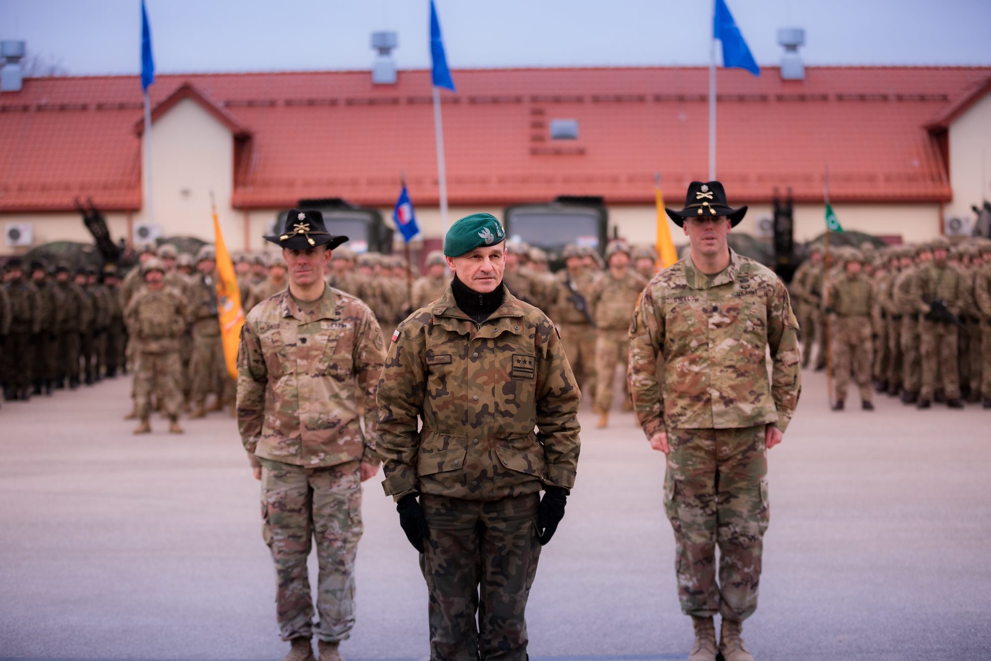 U.S. Army Lt. Col. Andrew Gallo, (left) commander assigned to the 3rd Squadron, 2d Cavalry Regiment, Polish Army Col. Bogdan Rycerski, (center) commander assigned to the 15th Mechanized Brigade, and Lt. Col. Mark O'Neill, (right) commander assigned to 3rd Squadron, 278th Cavalry Regiment, stand in front of the NATO enhanced Forward Presence Battle Group Poland formation in Bemowo Piskie, Poland, Jan. 20, 2020. NATO’s enhanced Forward Presence consists of four battalion-sized battle groups deploying on a persistent rotational basis to Estonia, Latvia, Lithuania and Poland to demonstrate the alliance’s determination and ability to act as one in response to any aggression against its members. (U.S. Army photo by Sgt. Timothy Hamlin)