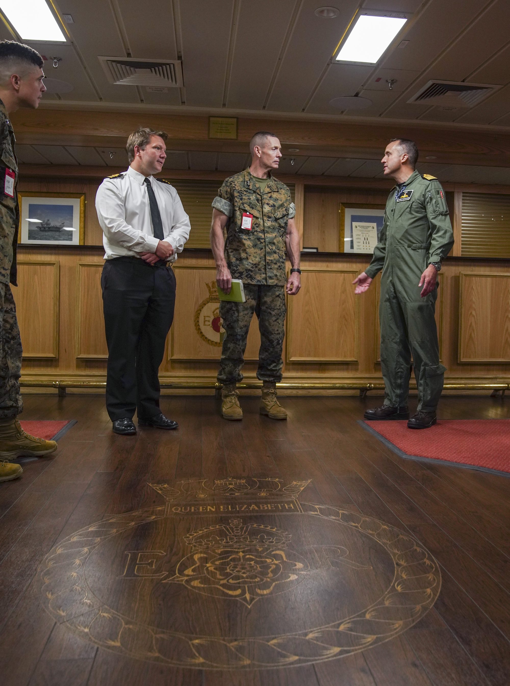 Maj. Gen. Stephen M. Neary, center, commander of U.S. Marine Corps Forces Europe and Africa, visits with members of the UK Royal Navy and Col. Doran, right, the senior U.S. national representative to Carrier Strike Group-21, aboard the HMS QNLZ in Portsmouth, England, August 27, 2020. Maj. Gen. Neary toured the ship to increase understanding of Marine Fighter Attack Squadron (VMFA) 211’s future operations with the UK’s Carrier Strike Group-21 during an upcoming deployment alongside their Royal Navy and Royal Marine Corps counterparts. (U.S. Marine Corps photo by Staff Sgt. Brytani Musick)