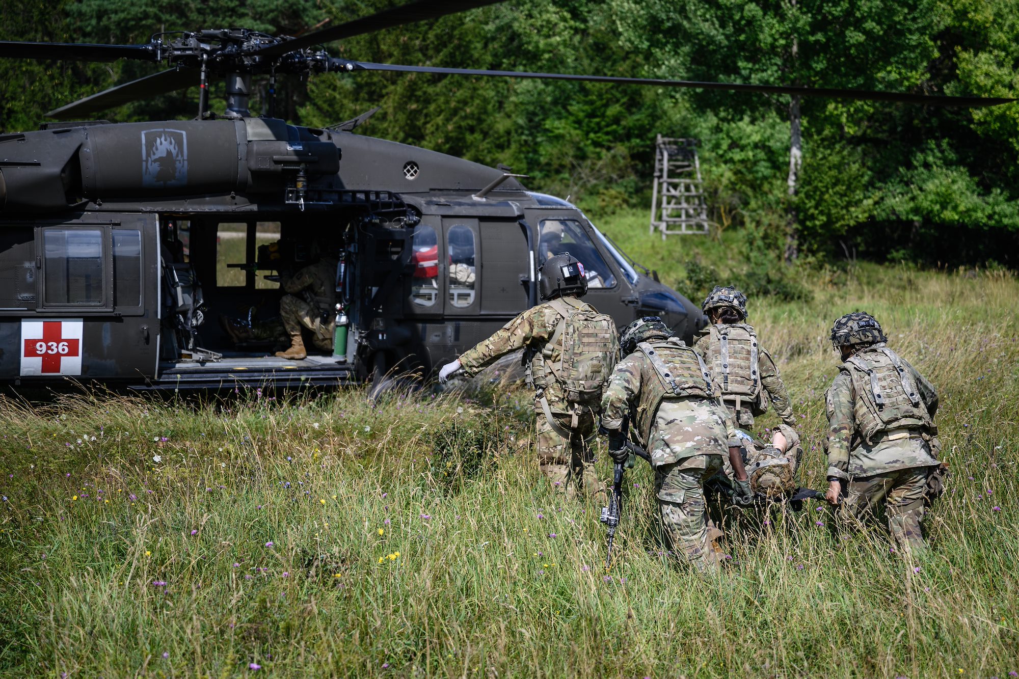 U.S. Army Sgt. Derek Born from Charlie Company, 1st Battalion, 214th Aviation Regiment loads a casualty in a HH-60 Blackhawk helicopter at a mass casualty exercise during Saber Junction 20, Aug. 15, 2020, at Hohenfels Training Area. Saber Junction 20 is a 7th Army Training Command-conducted, U.S. Army Europe-directed annual exercise designed to assess the readiness of the U.S. Army’s 173rd Airborne Brigade to execute unified land operations in a joint, combined environment, and to promote interoperability with participating allies and partner nations. This year’s exercise will take place primarily at 7ATC’s Grafenwoehr and Hohenfels Training Areas in Bavaria. U.S. military forces stationed in Europe routinely conduct these types of exercises with allied and partner nations to enhance interoperability and readiness. (U.S. Army photo by Sgt. 1st Class Garrick W. Morgenweck)