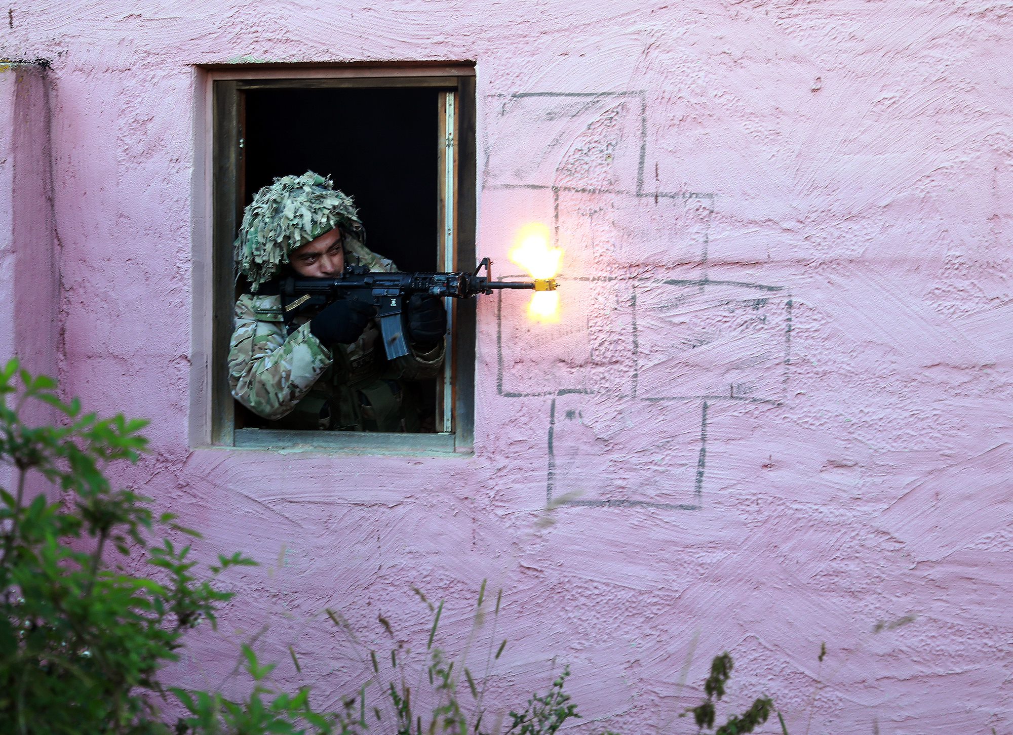 A Georgian soldier engages from a window during Exercise Saber Junction 20 at the Hohenfels Training Area, Germany, Aug. 20, 2020.Saber Junction 20 is a 7th Army Training Command-conducted, U.S. Army Europe-directed annual exercise designed to assess the readiness of the U.S. Army’s 173rd Airborne Brigade to execute unified land operations in a joint, combined environment, and to promote interoperability with participating allies and partner nations. (U.S. Army photo by Sgt. Thomas Stubblefield)