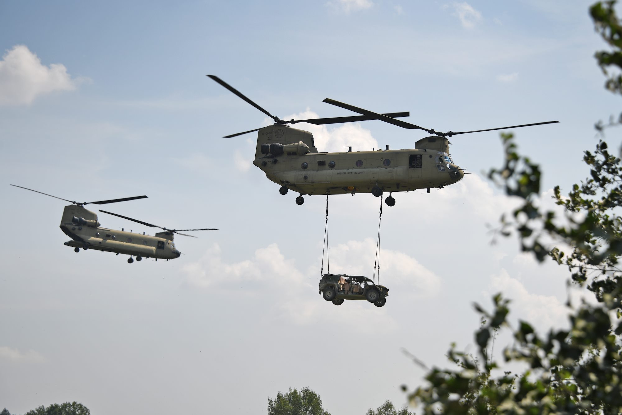 U.S. Army CH-47 Chinook helicopters assigned to B Company, 1st General Support Aviation Battalion, 214th Aviation Regiment, 12th Combat Aviation Brigade carrying U.S. Paratroopers assigned to 173rd Airborne Brigade and sling load lift off during Exercise Saber Junction at the 7th Army Training Command's Grafenwoehr Training Area, Germany, August 10, 2020. Saber Junction 20 is a 7th Army Training Command-conducted, U.S. Army Europe-directed annual exercise designed to assess the readiness of the U.S. Army's 173rd Airborne Brigade to execute unified land operations in a joint, combined environment, and to promote interoperability with participating allies and partner nations. This year's exercise will take place primarily at 7ATC's Grafenwoehr and Hohenfels Training Areas in Bavaria. U.S. military forces stationed in Europe routinely conduct these types of exercises with allied and partner nations to enhance interoperability and readiness.