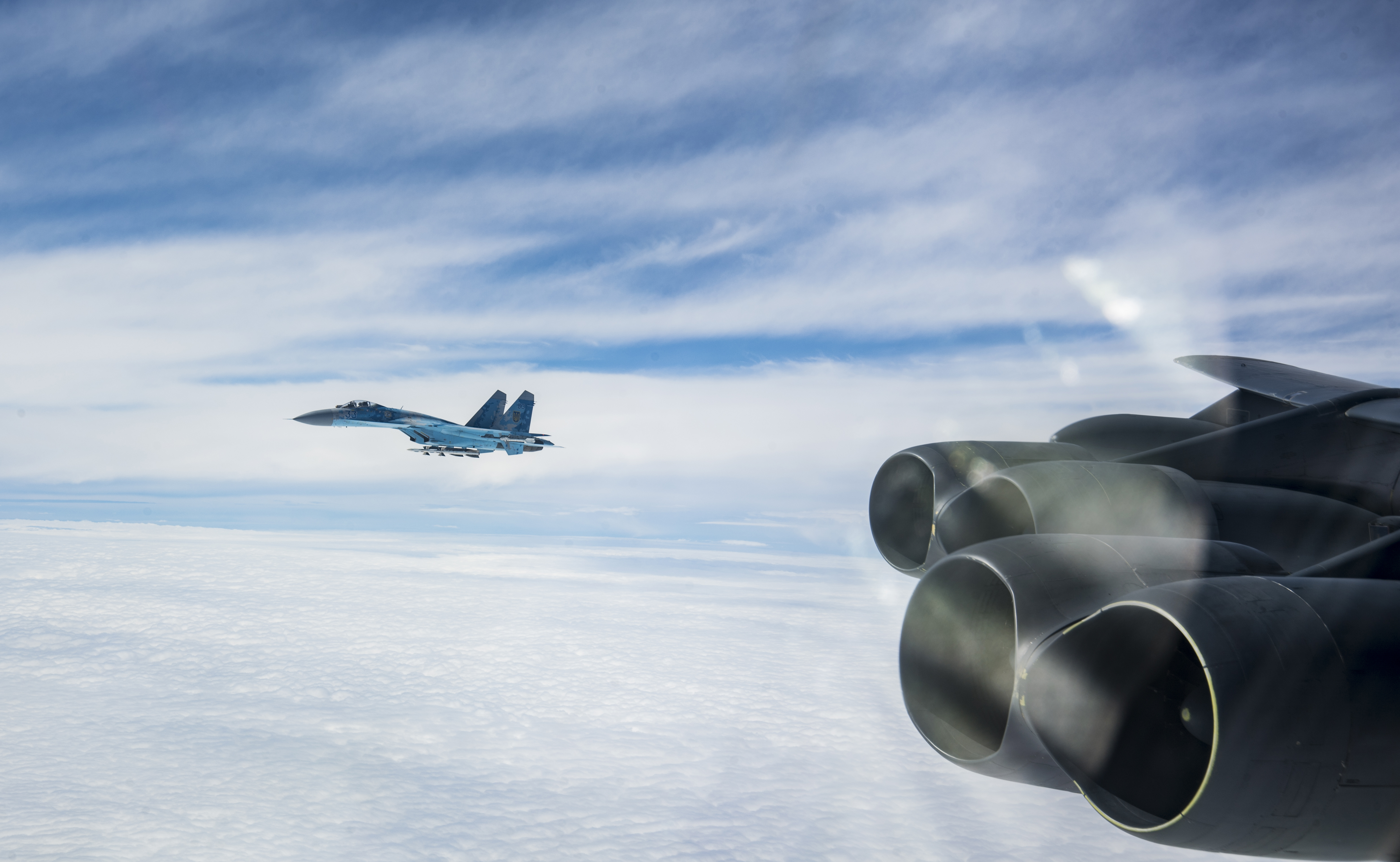 A Ukraine SU-27 integrates with a U.S. B-52H Stratofortress assigned to the 5th Bomb Wing, Minot Air Force Base, North Dakota, during a Bomber Task Force Europe mission, Sept. 4, 2020. Operations and engagements with our allies and partners demonstrate and strengthen our shared commitment to global security and stability. (U.S. Air Force photo by Senior Airman Xavier Navarro)