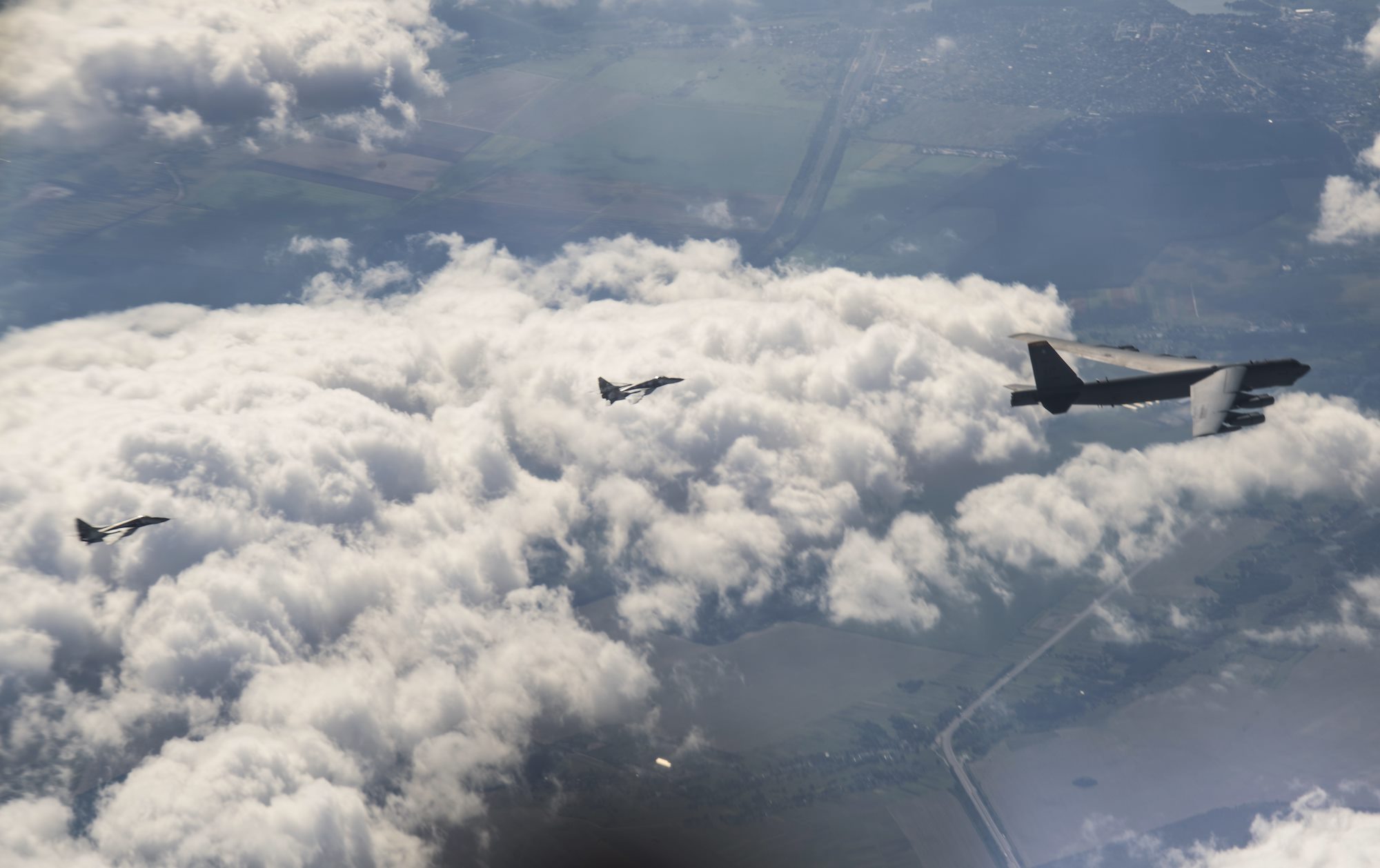 A U.S. B-52H Stratofortress aircraft assigned to the 5th Bomb Wing, Minot Air Force Base, North Dakota, integrate with Ukraine SU-27's for a Bomber Task Force Europe mission, Sept. 4, 2020. Operations and engagements with our allies and partners demonstrate and strengthen our shared commitment to global security and stability. (U.S. Air Force photo by Senior Airman Xavier Navarro)