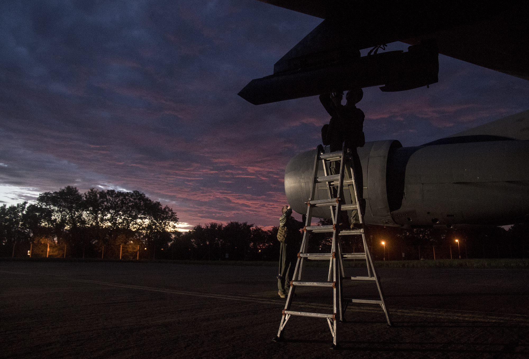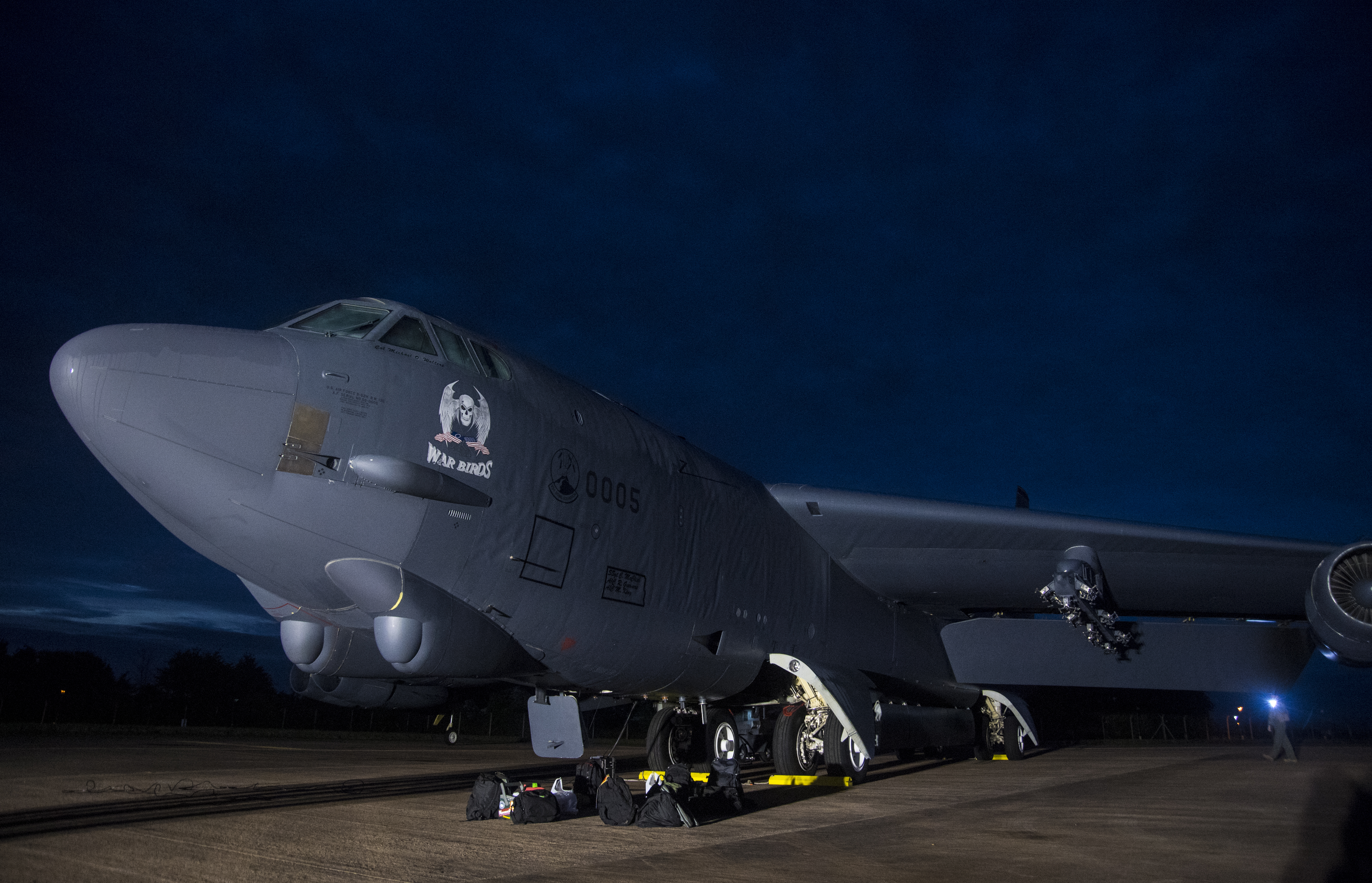 A U.S. B-52H Stratofortress assigned to the 5th Bomb Wing, Minot Air Force Base, North Dakota, is preparing for a preflight check before a Bomber Task Force Europe mission, Sept. 4, 2020. Operations and engagements with our allies and partners demonstrate and strengthen our shared commitment to global security and stability. (U.S. Air Force photo by Senior Airman Xavier Navarro)