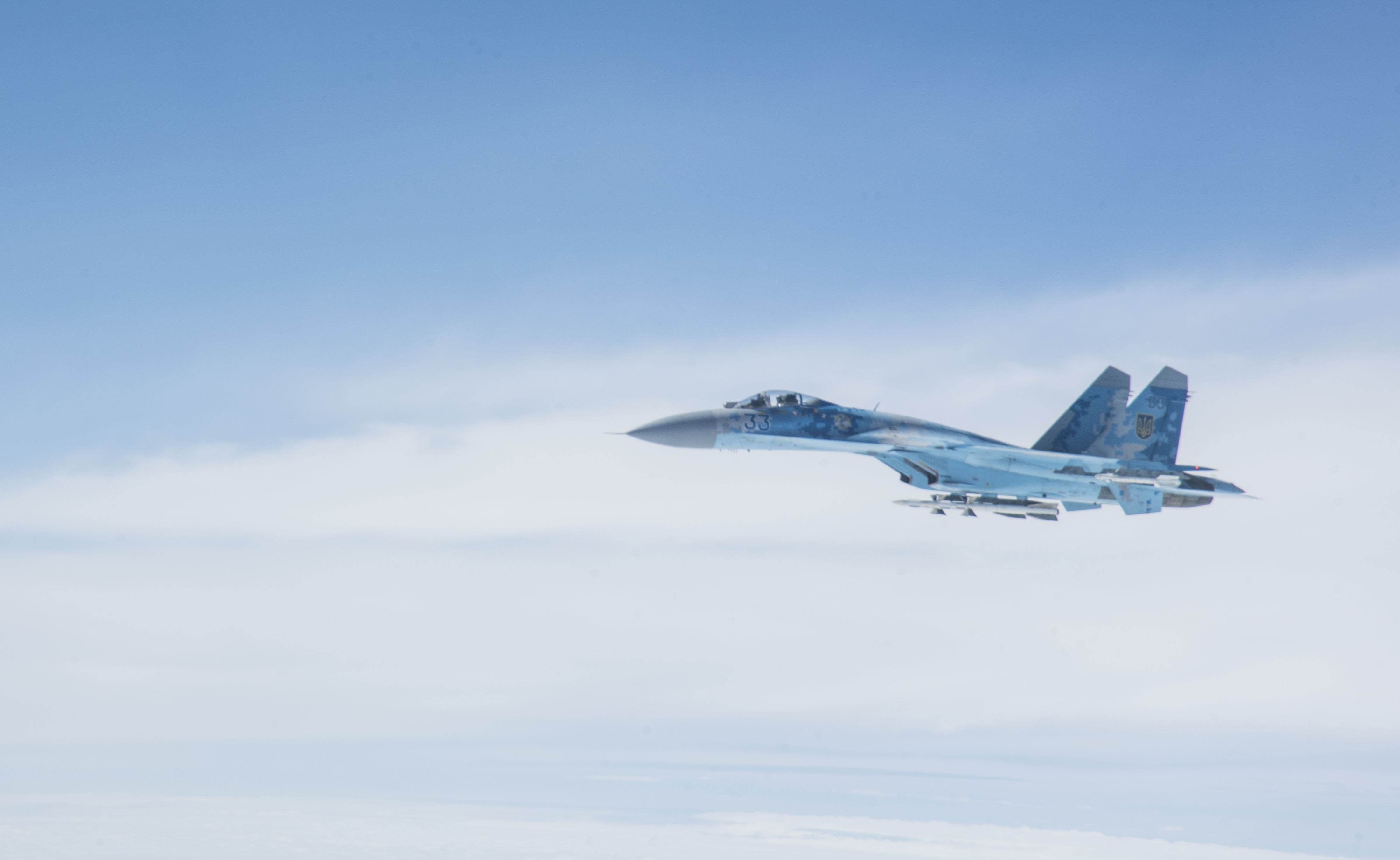 A Ukraine SU-27 integrates with a U.S. B-52H Stratofortress assigned to the 5th Bomb Wing, Minot Air Force Base, North Dakota, during a Bomber Task Force Europe mission, Sept. 4, 2020. Operations and engagements with our allies and partners demonstrate and strengthen our shared commitment to global security and stability. (U.S. Air Force photo by Senior Airman Xavier Navarro)