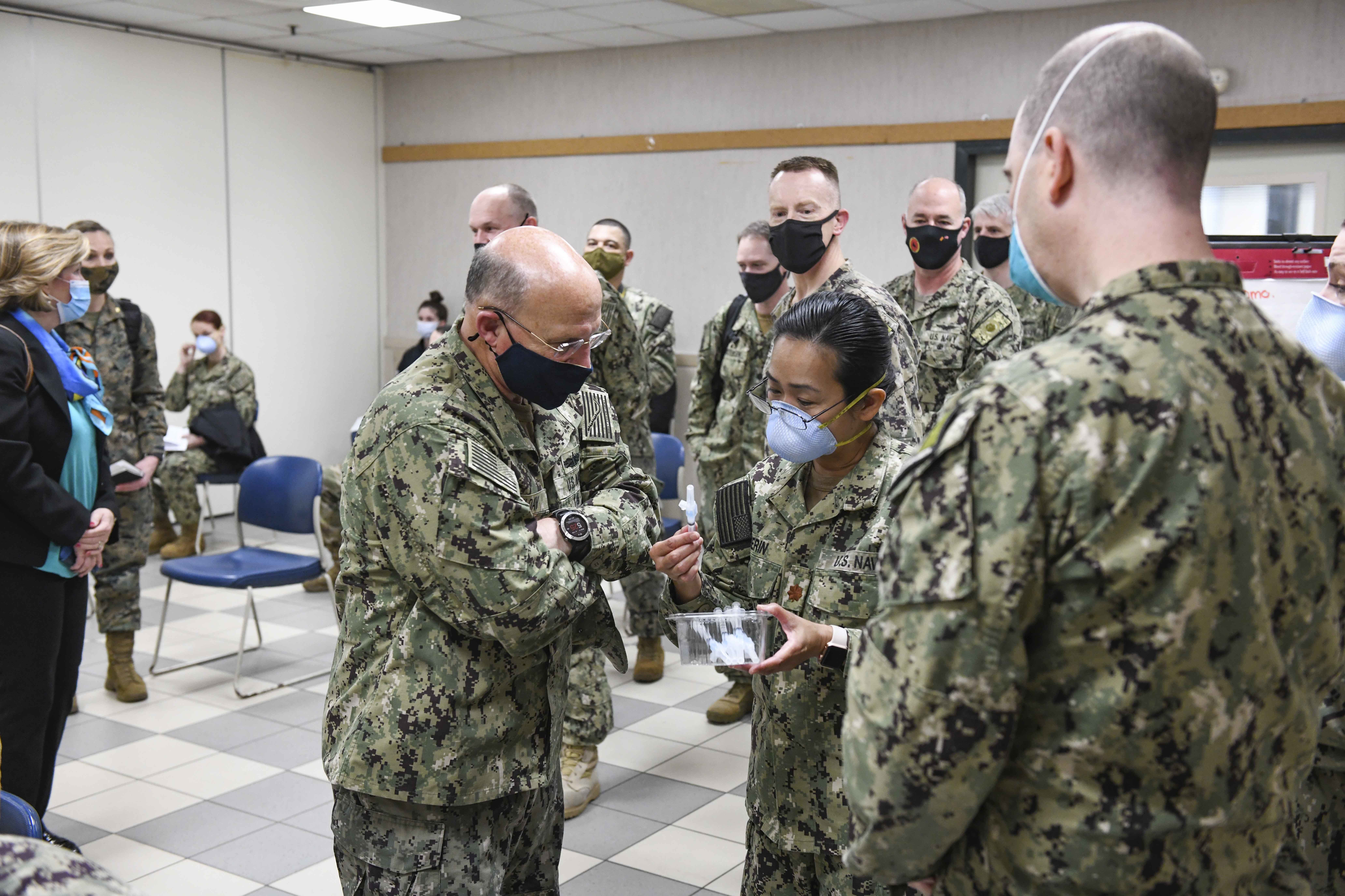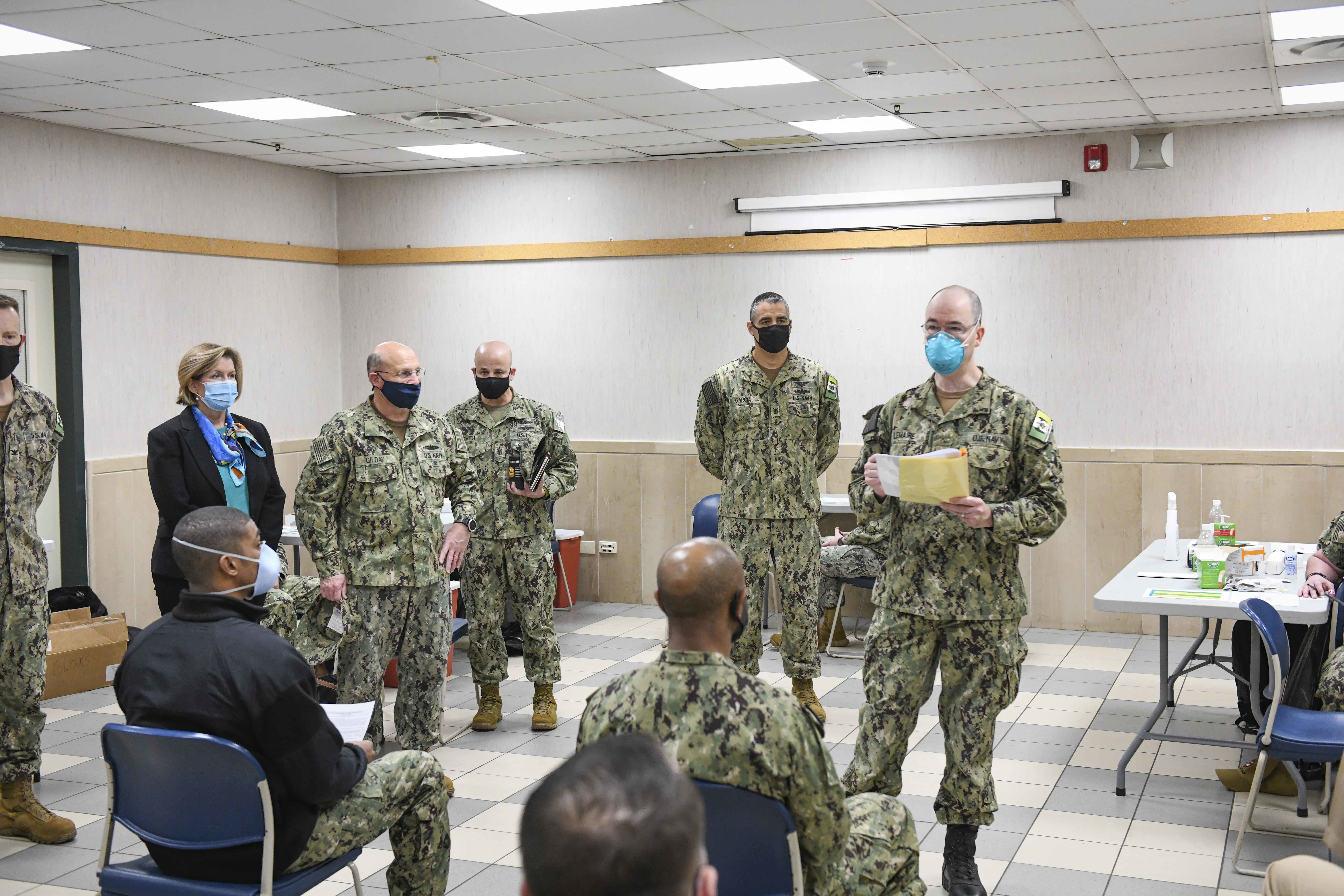210111-N-DO281-0029 NAVAL SUPPORT ACTIVITY NAPLES, Italy (Jan. 11, 2021) Adm. Mike Gilday, Chief of Naval Operations, observes COVID-19 vaccination site at Naval Support Activity Naples Support Site, Italy, Jan. 11, 2021. U.S. Naval Forces Europe-Africa, headquartered in Naples, Italy, conducts the full spectrum of joint and naval operations, often in concert with allied and interagency partners, in order to advance U.S. national interests, security and stability in Europe and Africa. (U.S. Navy photo by Mass Communication Specialist 3rd Class Trey Fowler/ Released)