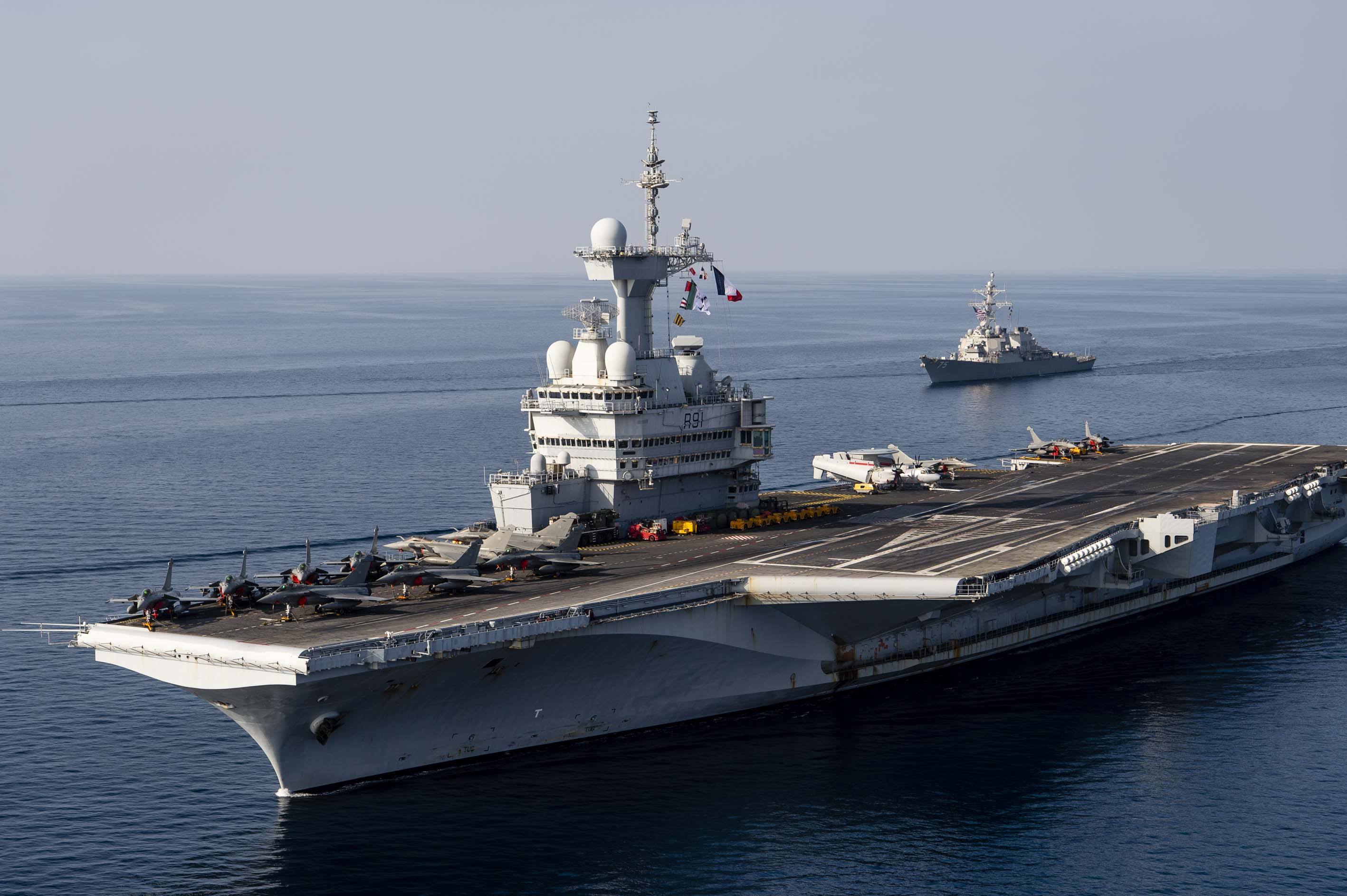 The Charles de Gaulle Carrier Strike Group is made up of French ships multi-mission frigate (FREMM) Auvergne and (FREMM) Provence, air defense frigate (FDA) Chevalier Paul and their air wing; Belgium navy command and refueling vessel (BCR) Var and frigate HNLMS Leopold I (F-930); Greek navy multi-mission frigate HS Kanaris (F-464); U.S. Navy guided-missile destroyer USS Donald Cook (DDG-75) and USS San Juan (SSN-751).
