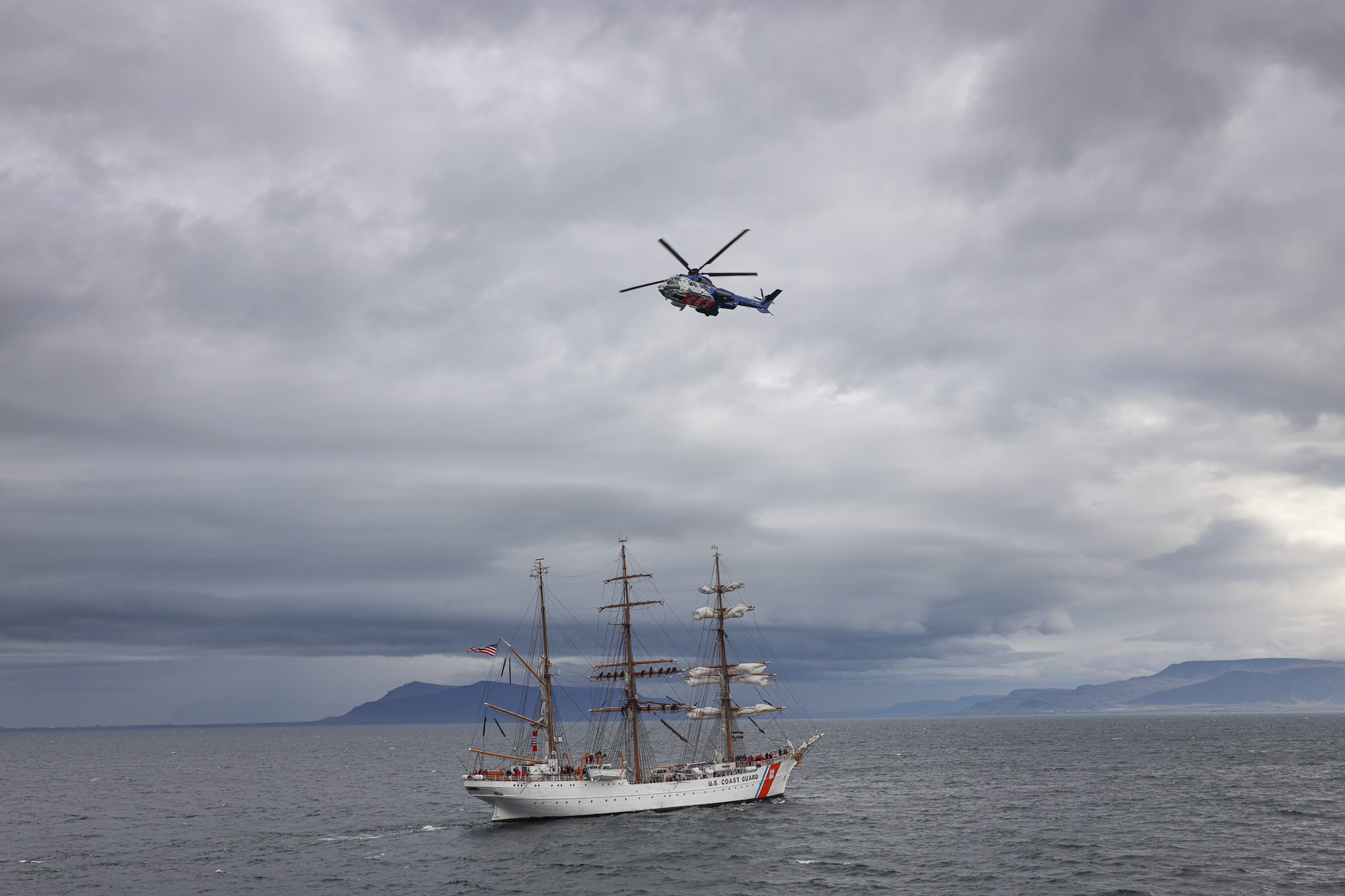 USCGC Eagle (WIX 327), "America's Tall Ship," arrives in Reykjavik, Iceland, on June 9, 2021. Eagle is currently conducting summer U.S. Coast Guard Academy cadet training in at-sea leadership and professional development. Their first port call was Portugal in late May. Eagle has served as a classroom at sea to future Coast Guard officers since 1946, offering an at-sea leadership and professional development experience as part of the Coast Guard Academy curriculum. (Photo courtesy U.S. Embassy Reykjavik, Kristjan Petersson)