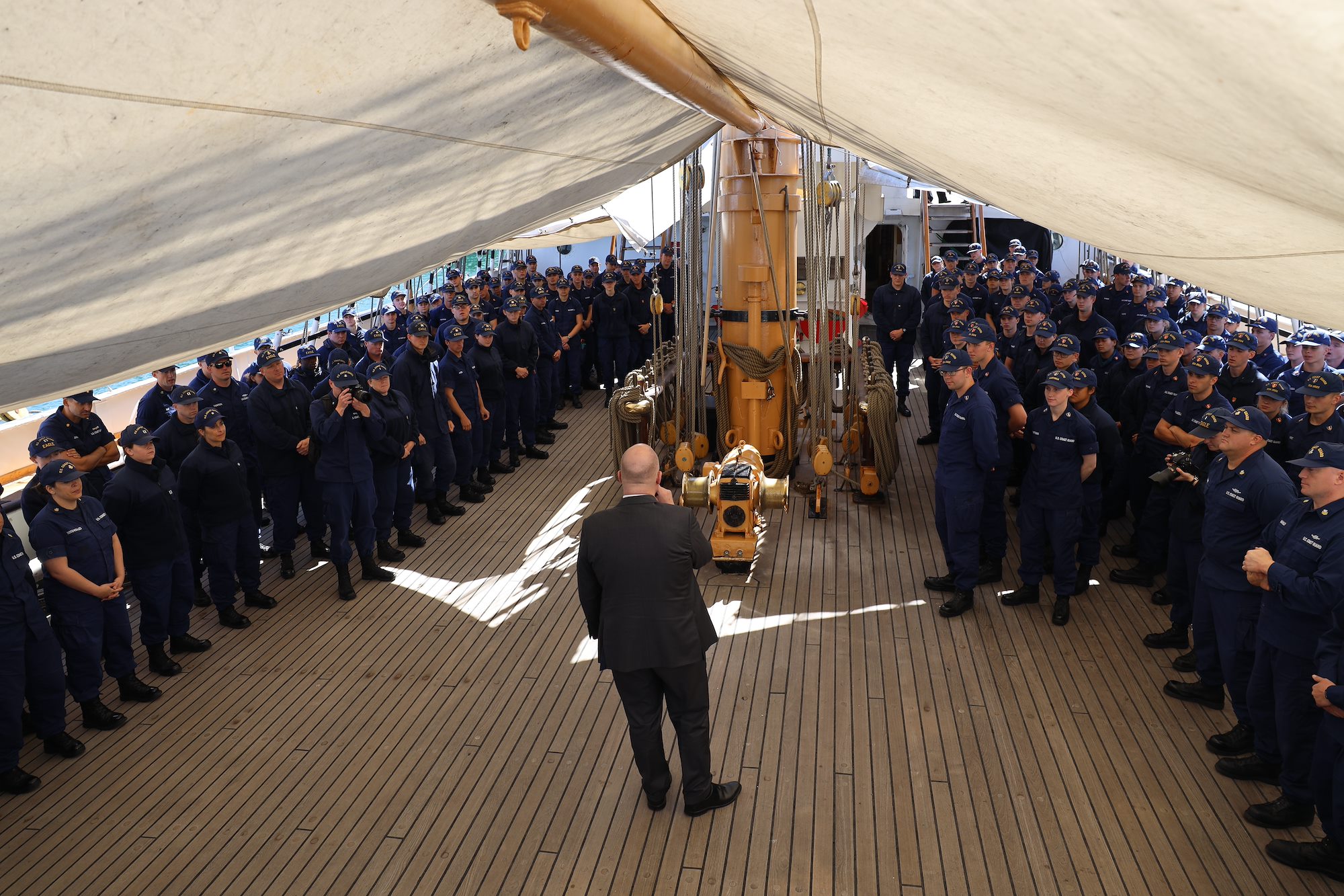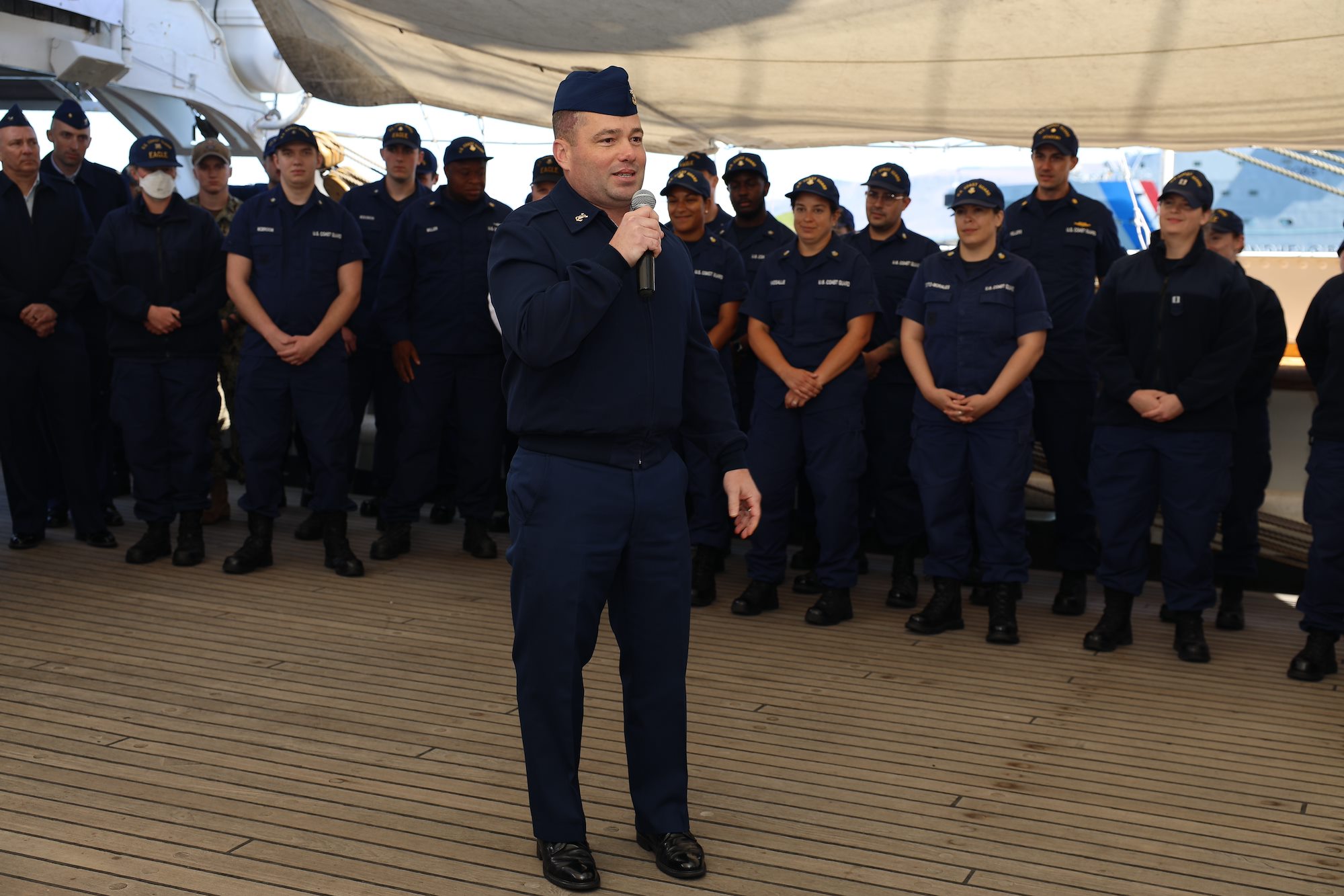 Master Chief Petty Officer Devin Spencer, command master chief U.S. Coast Guard Atlantic Area, addresses the crew of USCGC Eagle (WIX 327), "America's Tall Ship," in Reykjavik, Iceland, June 12, 2021. Eagle is currently conducting summer U.S. Coast Guard Academy cadet training in at-sea leadership and professional development fruit visiting Portugal, now Iceland, followed by Bermuda. (U.S. Coast Guard photo by Petty Officer 3rd Class Ryan Schultz)
