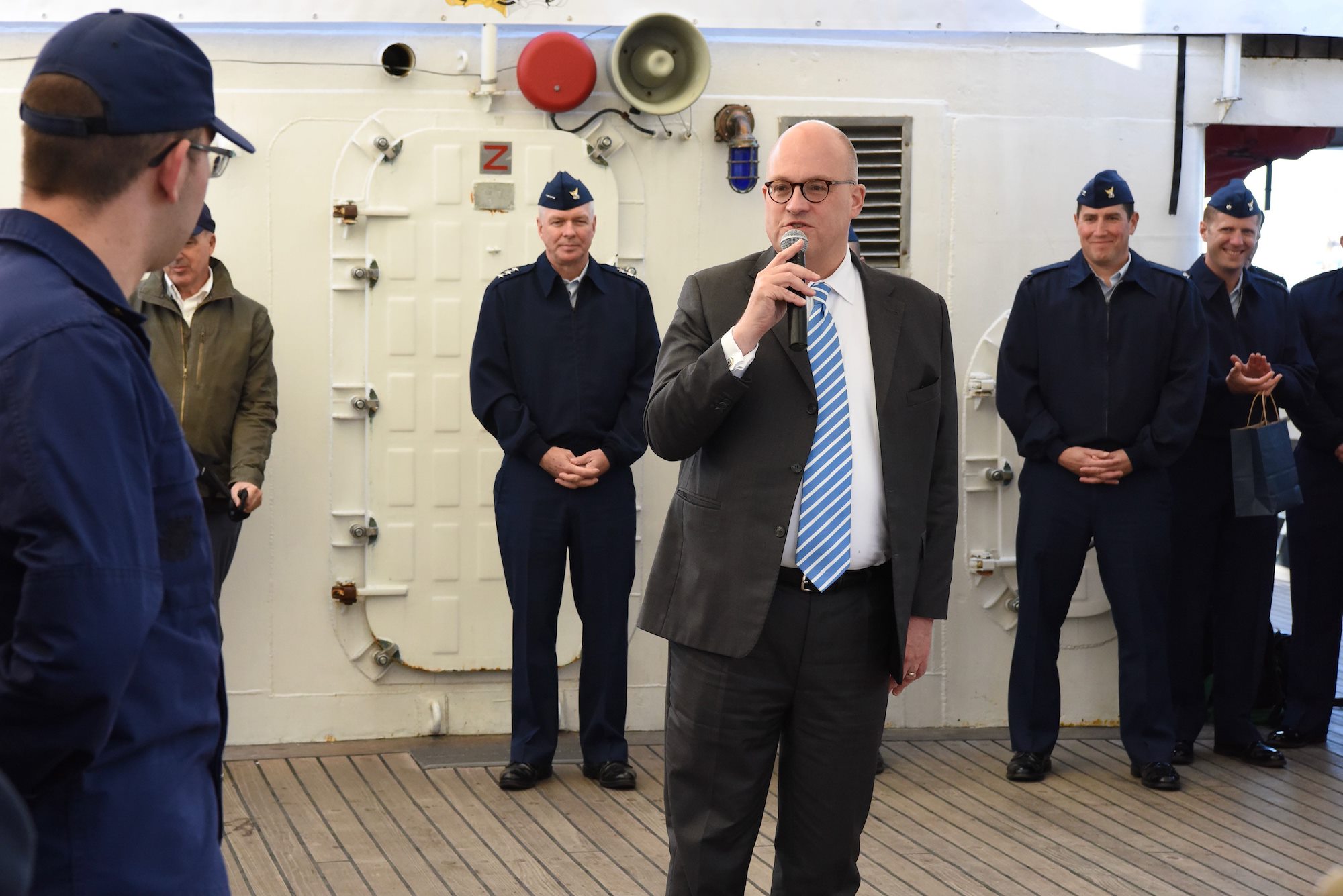 Jonathan Moore, principal deputy assistant secretary, Bureau of Oceans and International Environmental and Scientific Affairs, addresses the crew of USCGC Eagle (WIX 327), "America's Tall Ship," in Reykjavik, Iceland, June 12, 2021. Eagle is currently conducting summer U.S. Coast Guard Academy cadet training in at-sea leadership and professional development, first visiting Portugal, now Iceland, followed by Bermuda. (U.S. Coast Guard photo by Petty Officer 3rd Class Ryan Schultz)