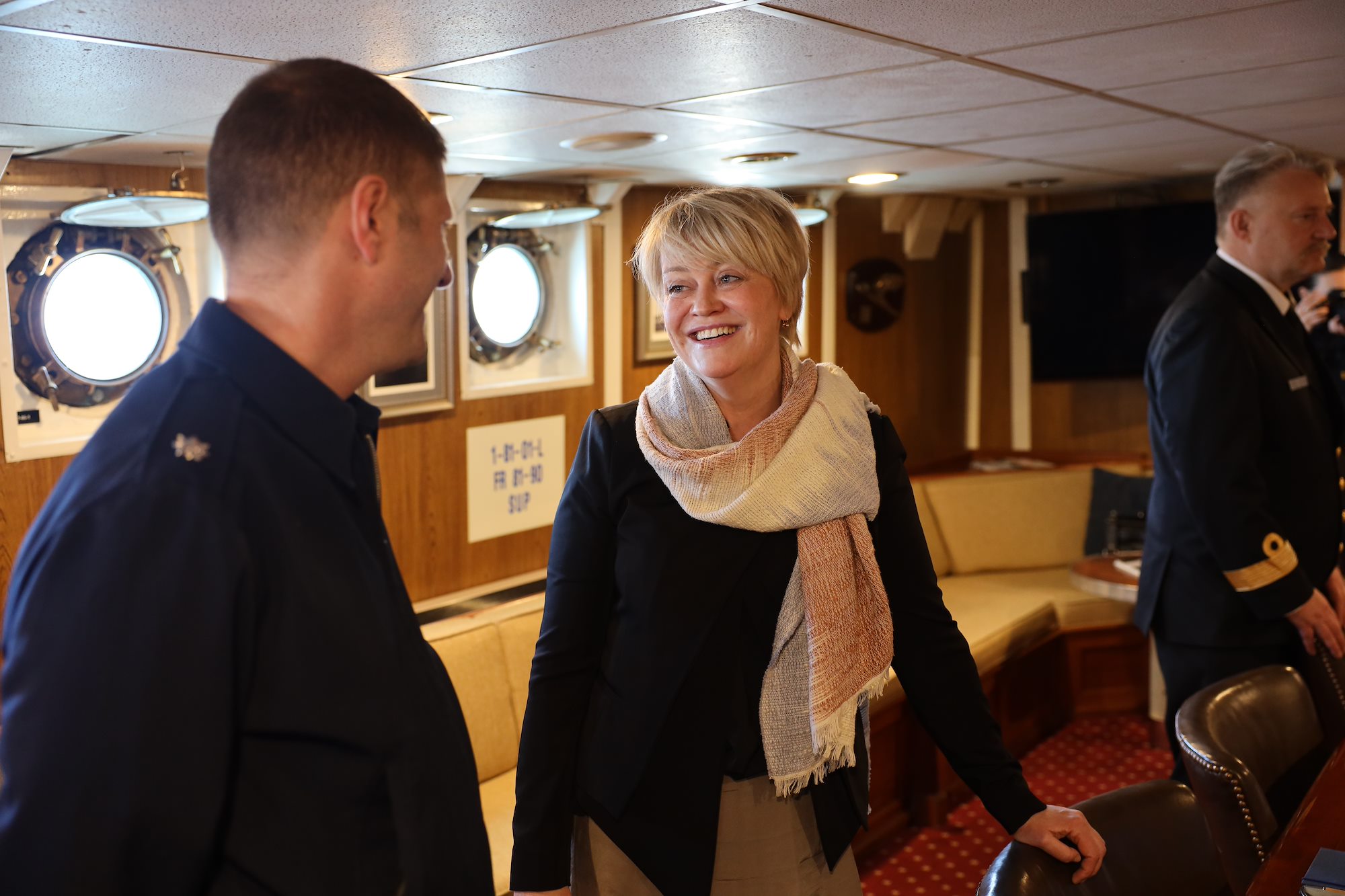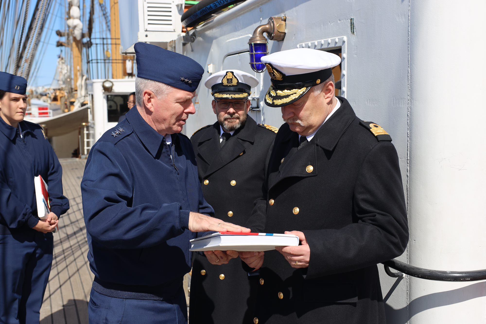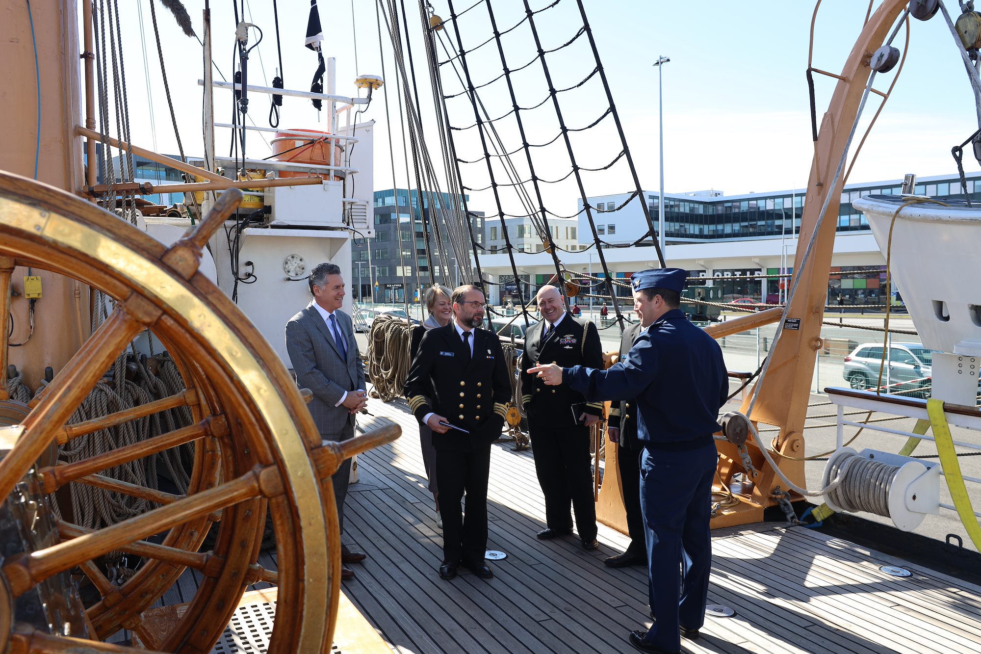 Aboard Eagle moored in the harbor, Vice Adm. Steven Poulin, commander U.S. Coast Guard Atlantic Area, joined by Jonathan Moore, principal deputy assistant secretary, Bureau of Oceans and International Environmental and Scientific Affairs, met with Commadore Asgrimur Asgrimsson of the Icelandic coast guard, Chargé d'Affaires Harry Kamian, and Byrndis Kjartansdottir, director of security and defense directorate in the Icelandic Ministry of Foreign Affairs.