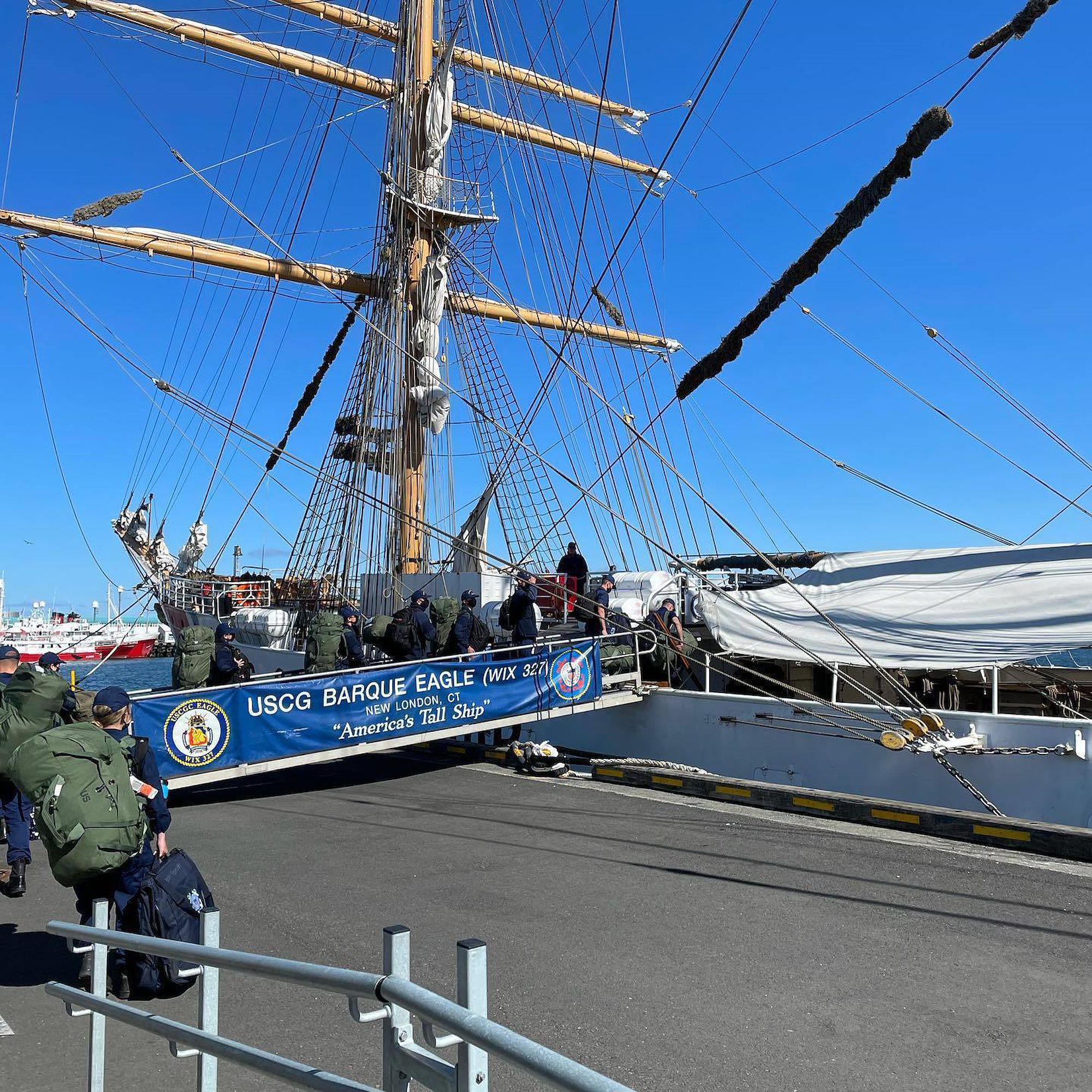 Phase 2 cadets board USCGC Eagle (WIX 327), "America's Tall Ship," in Reykjavik, Iceland, on June 12, 2021. Eagle is currently conducting summer U.S. Coast Guard Academy cadet training in at-sea leadership and professional development. Their first port call was Portugal in late May. Eagle has served as a classroom at sea to future Coast Guard officers since 1946, offering an at-sea leadership and professional development experience as part of the Coast Guard Academy curriculum. (U.S. Coast Guard photo by Lt. Stephanie Jocis)