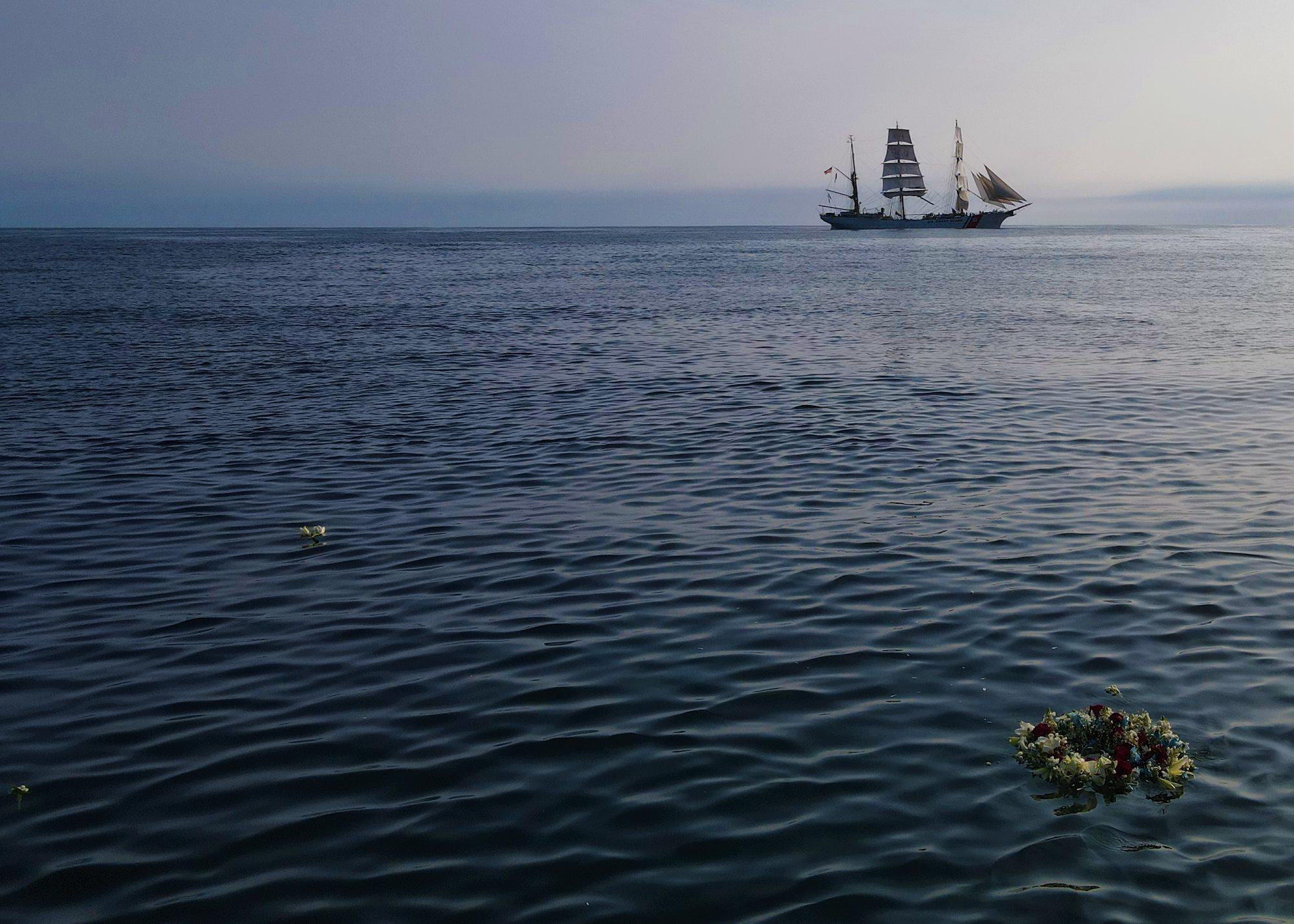 On approach to Iceland on June 6, 2021, the USCGC Eagle (WIX 3287) crew conducted a wreath-laying in memory of the Treasury-class USCGC Hamilton (WPG 34), torpedoed by German submarine U-132 in 1942, while patrolling the Icelandic coast near Reykjavík. Of the 221 person crew, 26 members were lost. (U.S. Coast Guard photo courtesy USCGC Eagle)