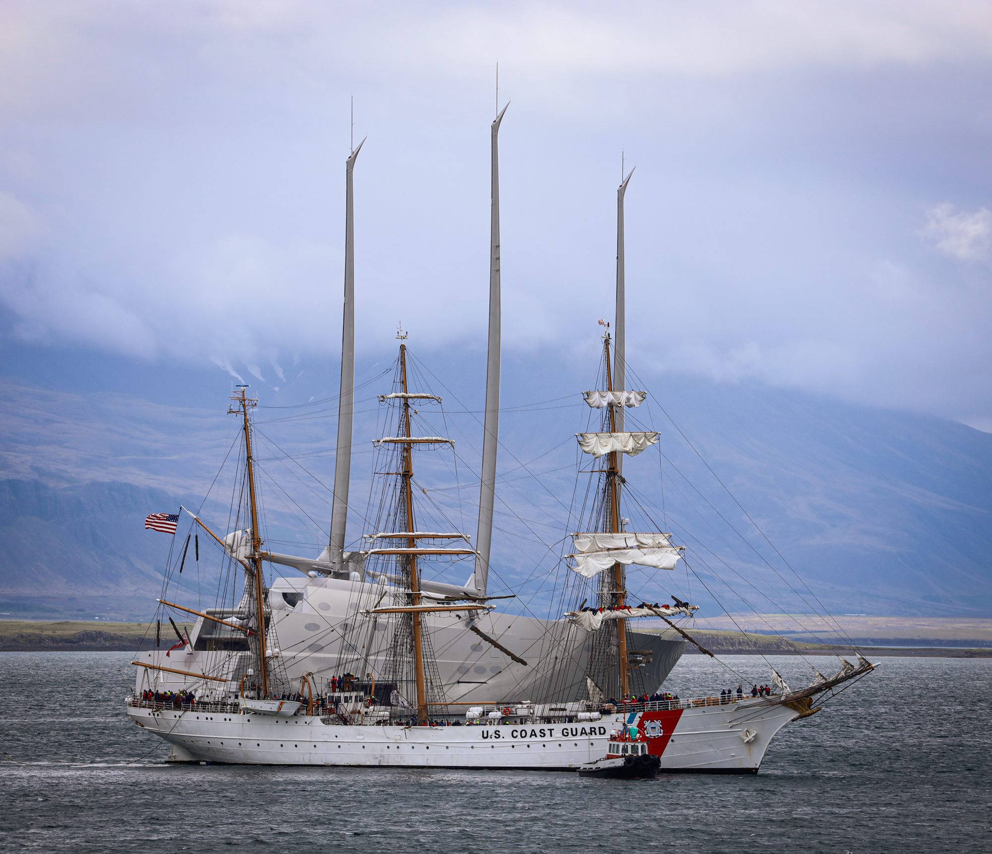 USCGC Eagle (WIX 327), "America's Tall Ship," arrives in Reykjavik, Iceland, on June 9, 2021, passing in front of the famous 468-foot sailing yacht A. Eagle is currently conducting summer U.S. Coast Guard Academy cadet training in at-sea leadership and professional development. (Photo courtesy U.S. Embassy Reykjavik, Kristjan Petersson)
