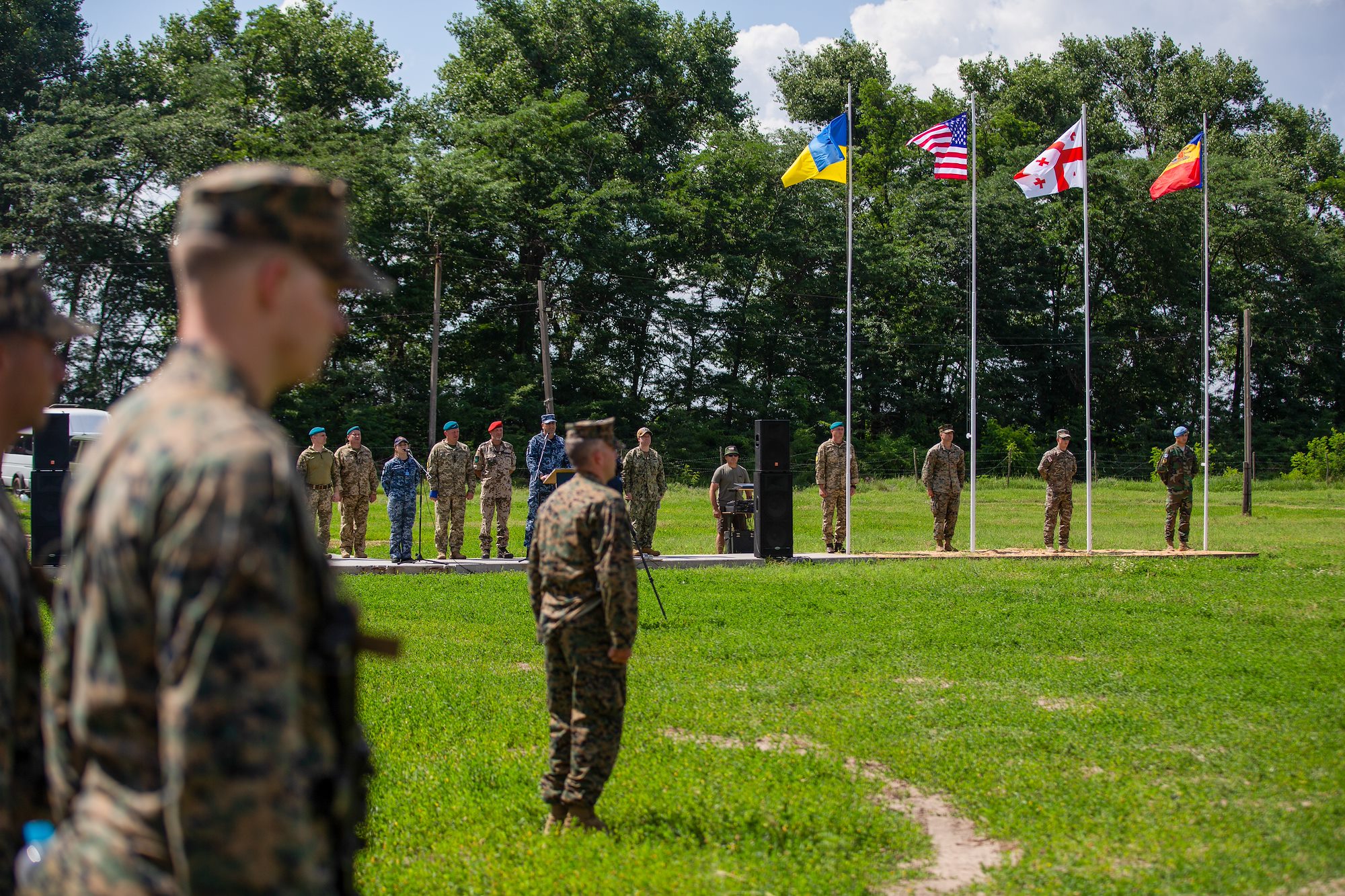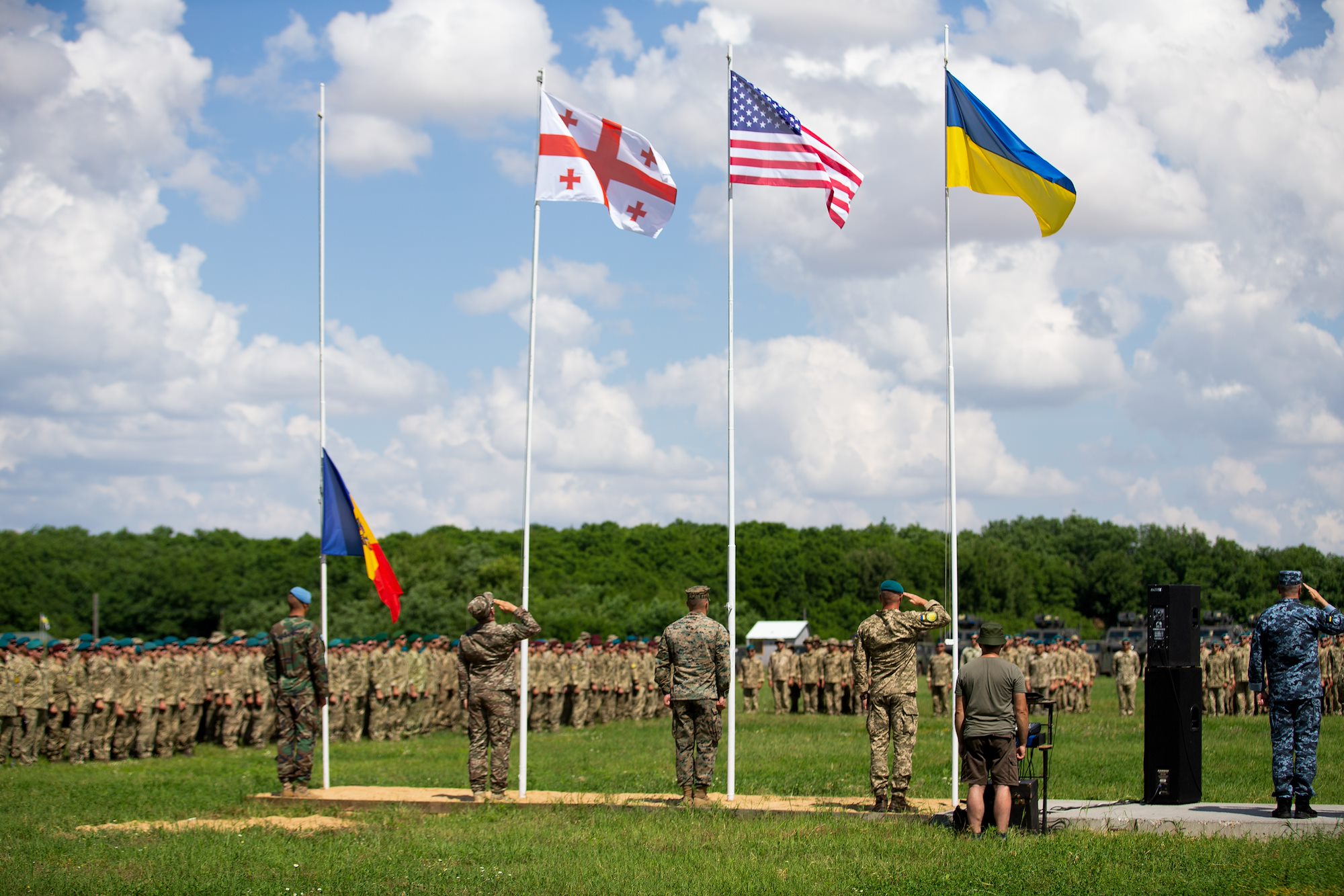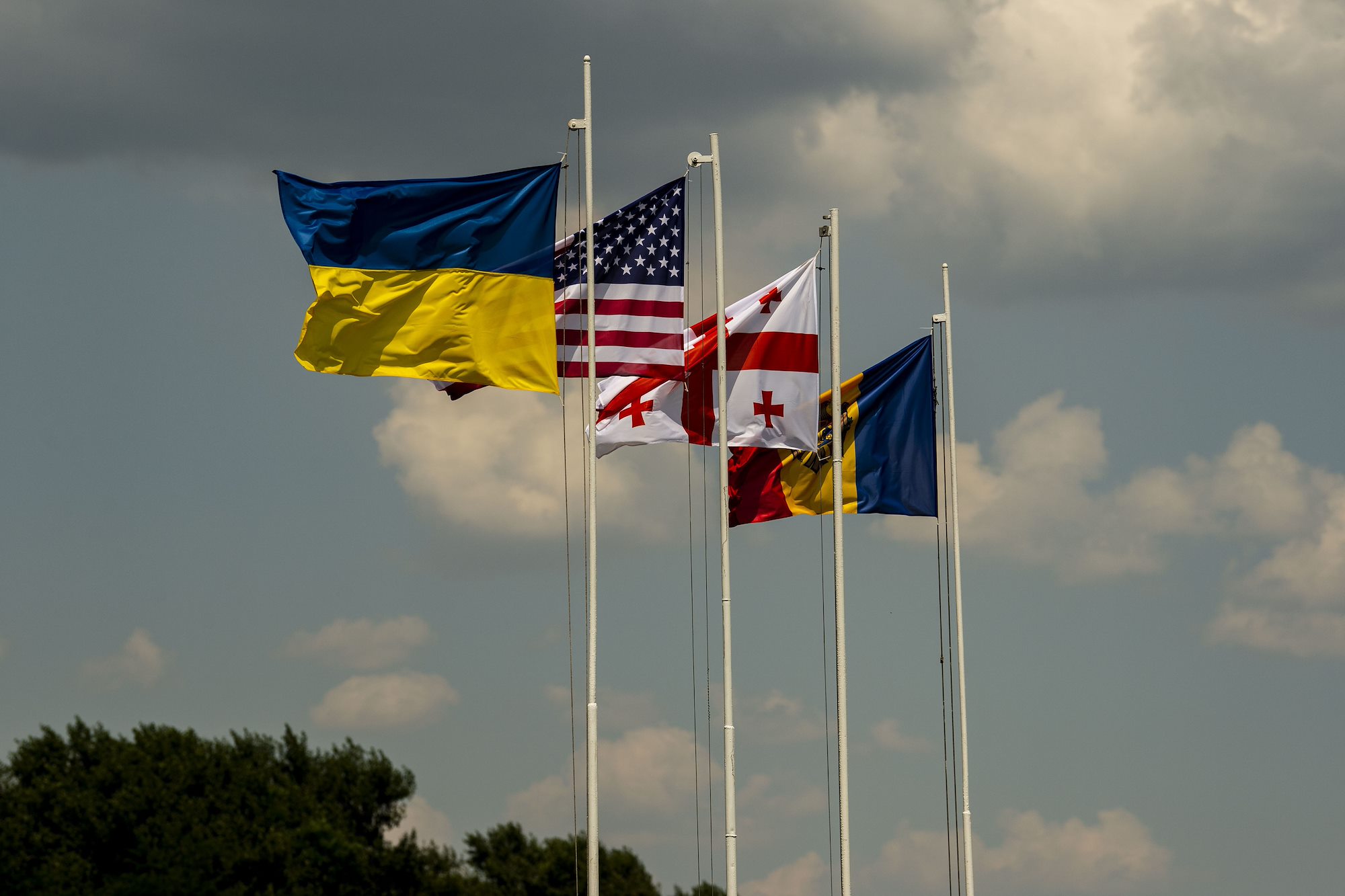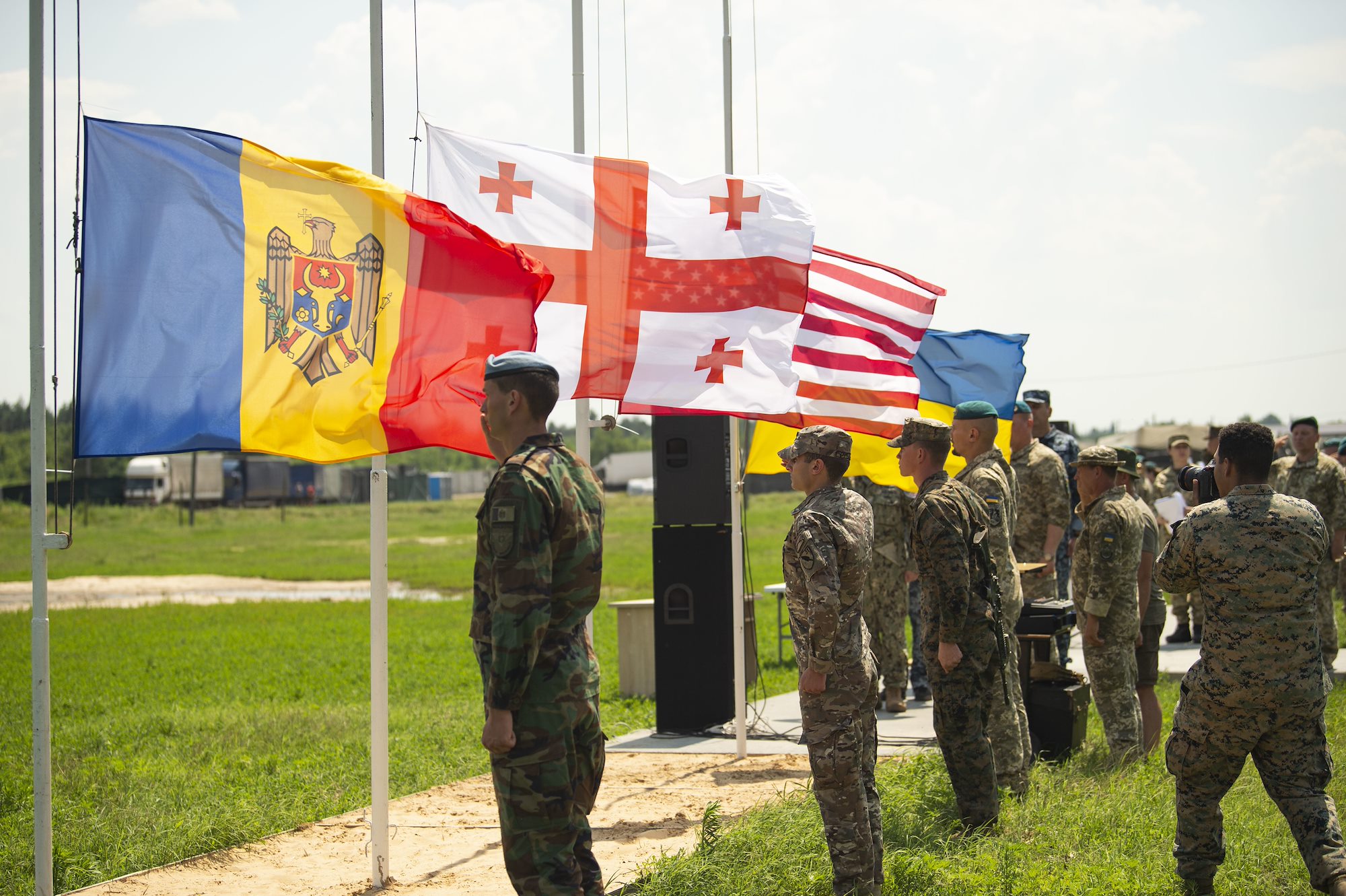 210710-N-VP310-0031 OLESHKY SANDS, Ukraine (July 10, 2021) Flags of Ukraine, U.S., Georgia and Romania fly at the closing ceremony of Exercise Sea Breeze 2021 in Oleshky Sands, Ukraine, July 10, 2021. Exercise Sea Breeze is a multinational maritime exercise cohosted by the U.S. Sixth Fleet and the Ukrainian Navy since 1997. Sea Breeze 2021 is designed to enhance interoperability of participating nations and strengthens maritime security and peace in the region. (U.S. Navy photo by Mass Communications Specialist 1st Class Richard Hoffner/Released)